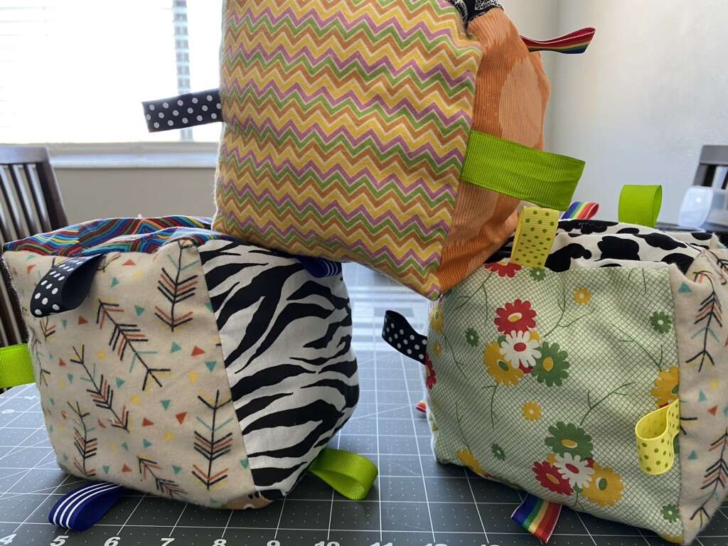 Baby block with grabbing tags. 6” square. 3-6 months until they grow out of it. Our boy loved his. $5 each Orange/ green x2 Green Green/multi