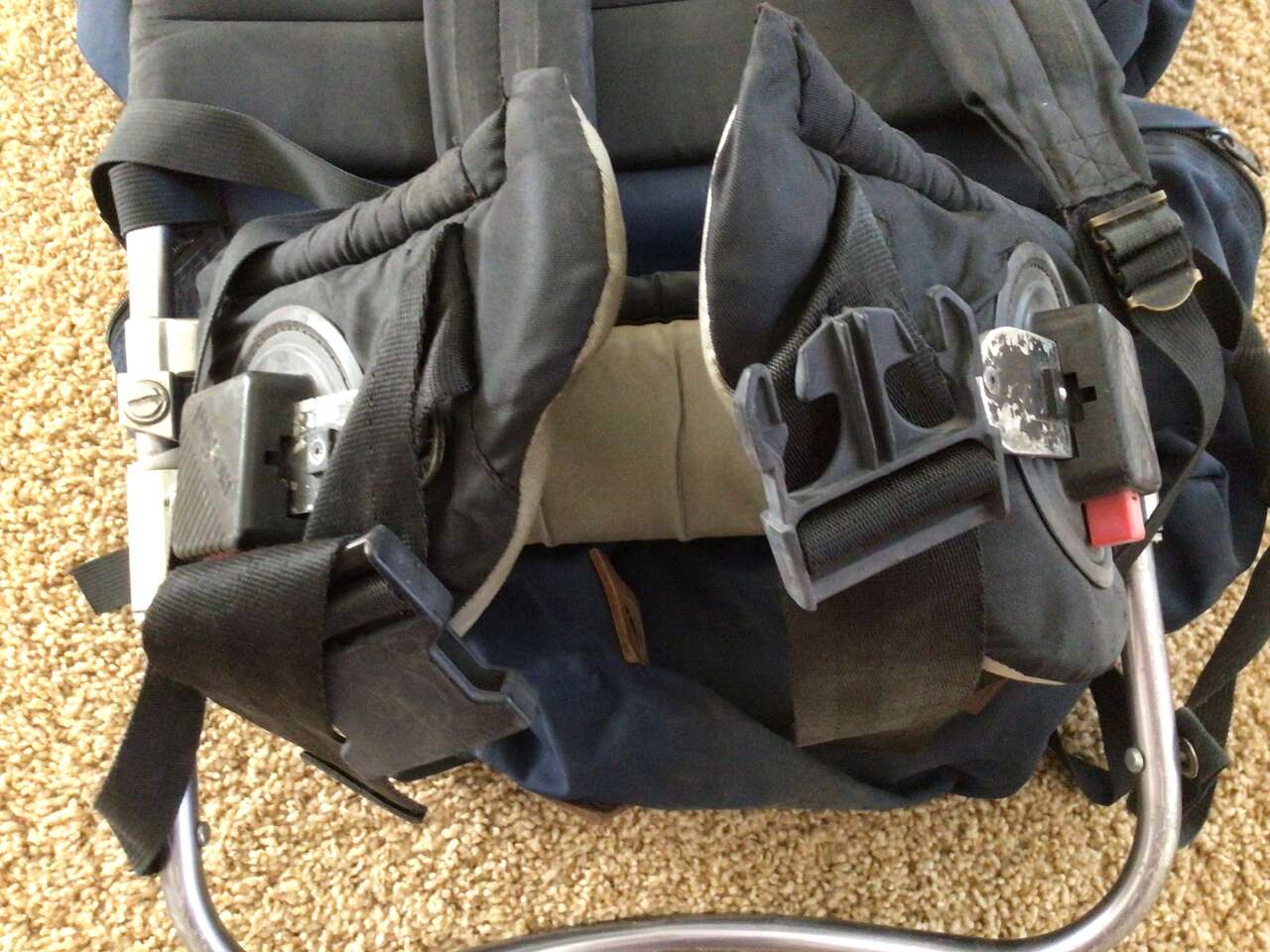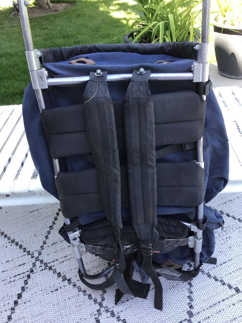 This listing is for an exterior frame backpack by Jansport, frame measures about 14.5 inches across and 38 inches tall. It has seen some use but it has a lot of life left in it. Other than needing a good washing, the only damage found is a couple of very minor small abrasions and a worn leather patch and worn off paint on the waist strap, see photos. I believe it was purchased around 1989 or 1990.