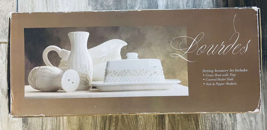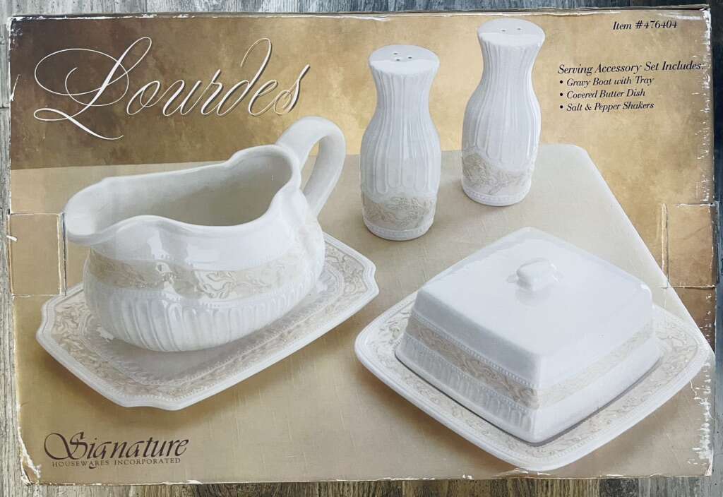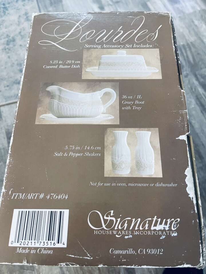 VenmoCondition: New unused, in box. Box is worn/damaged You can add a touch of elegance to your dining table with this Signature Housewares Lourdes butter dish, gravy boat, and salt & pepper shaker 4-piece set. The rectangular ivory ceramic pieces feature a beautiful Lourdes pattern, making them a stylish addition to any meal.