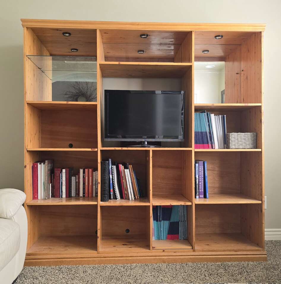 Custom built entertainment system and coffee table for family room or living room. Has three display lights, two glass shelfs for decor, and adjustable shelfs for books or stereo equipment or speakers with access holes for wires.