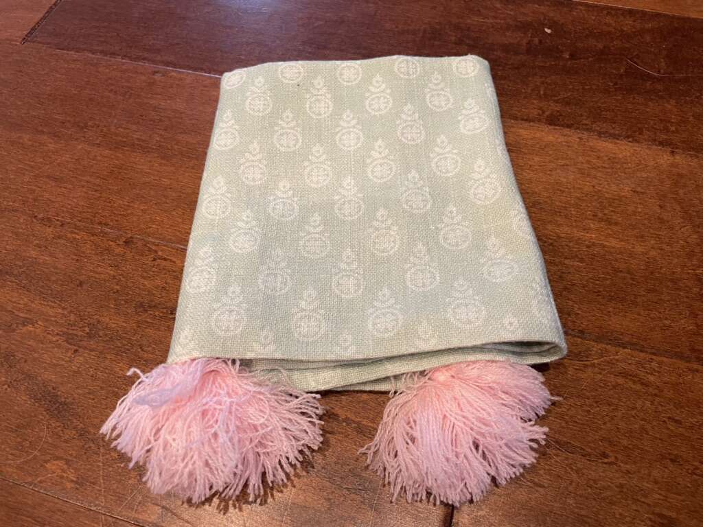 I have 2 new light teal or blue dish towels with a pink tassel on each corner. The pattern has small flowers. They are 17 1/2 inches wide and 28 1/2 inches long. They are 100 % cotton. They’re dish towels but the tags say spot clean only so I’m not sure what you would use them for. They were made by Two’s Company. The price tags show they were $10.95 each. I’m asking $4 for both of them together. See my other ads for jewelry, artwork, home decor and more.