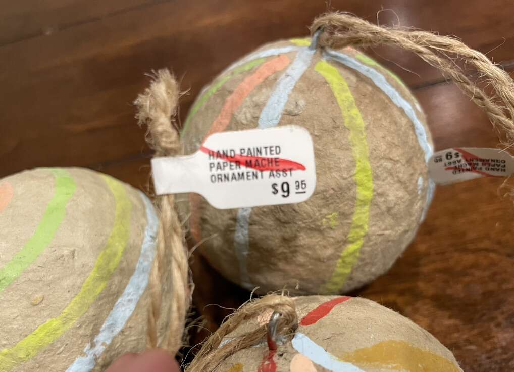 I have 4 new hand painted Papier Mache Christmas ornaments. They are natural brown color balls with painted stripes. They have rope loops for hanging. They are about 3 inches across and are fairly heavy for the size. The price tags show they were $9.95 each. I’m asking $8 for all of them together. See my other ads for jewelry, artwork, home decor and more.