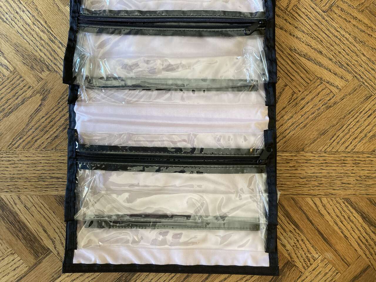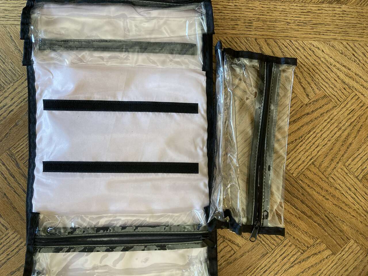 Hanging toiletry bag with 4 removable clear pouches measuring 30 X 9 inches. Plenty of storage for all your travel supplies and make-up. Text please, CASH only, pick up in Holladay area.