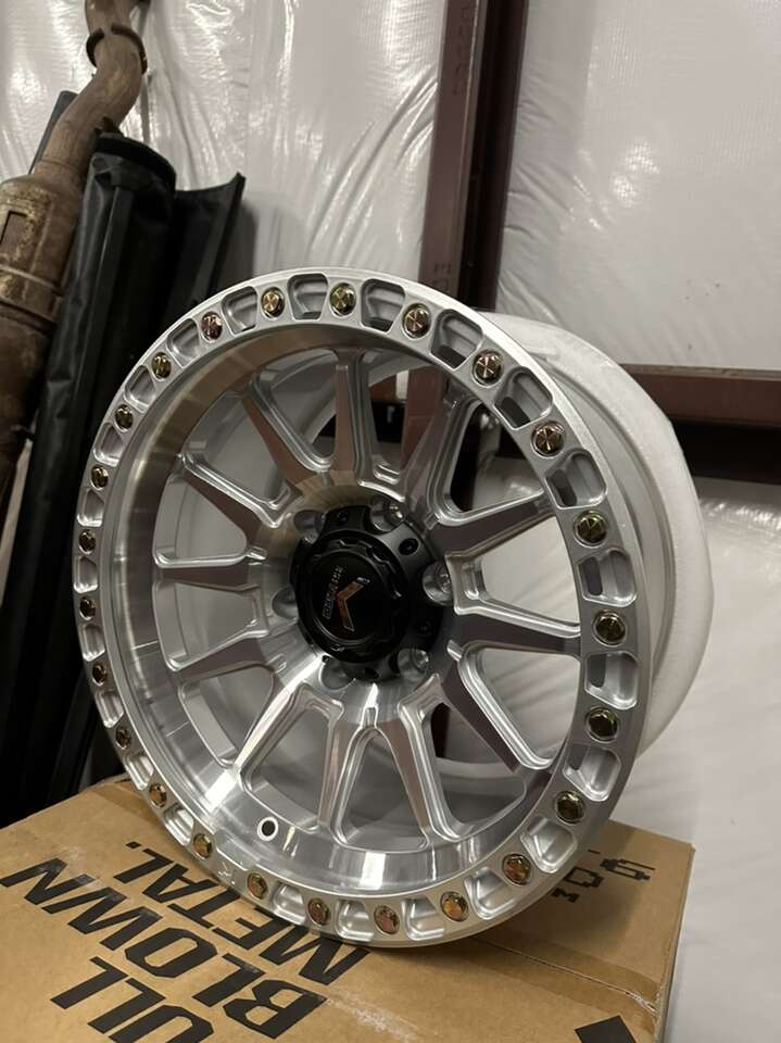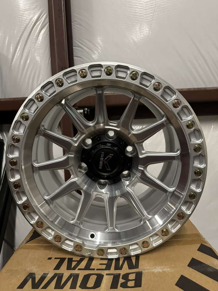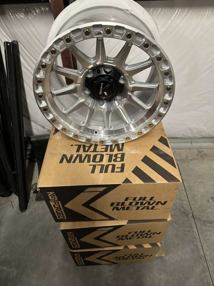 BRAND NEW IN THE BOX 17x9 kg1 forged Beadlock wheels Clear coated Machined aluminum finish Black beadlock rings.