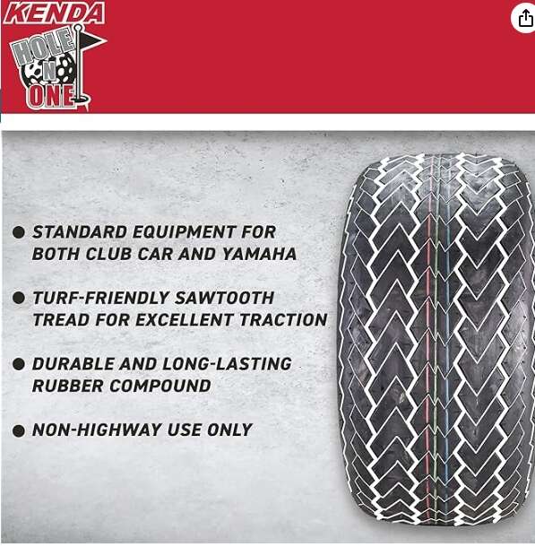 PayPalThe Kenda Hole N-1 is an all season tire manufactured for golf carts. The model ensures excellent all weather traction as the sawtooth tread elements improve the tire's traction in different weather conditions. This tread design enables the tire to perform without harming the grass field improving its usability on turf terrain surfaces. The Hole N-1 promotes a longer lasting tread life as the durable compound and the flat footprint guarantee a slow and even tread wear rate.