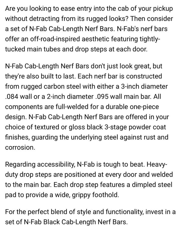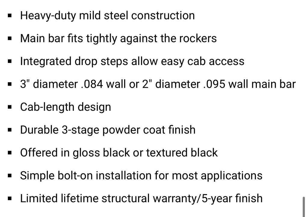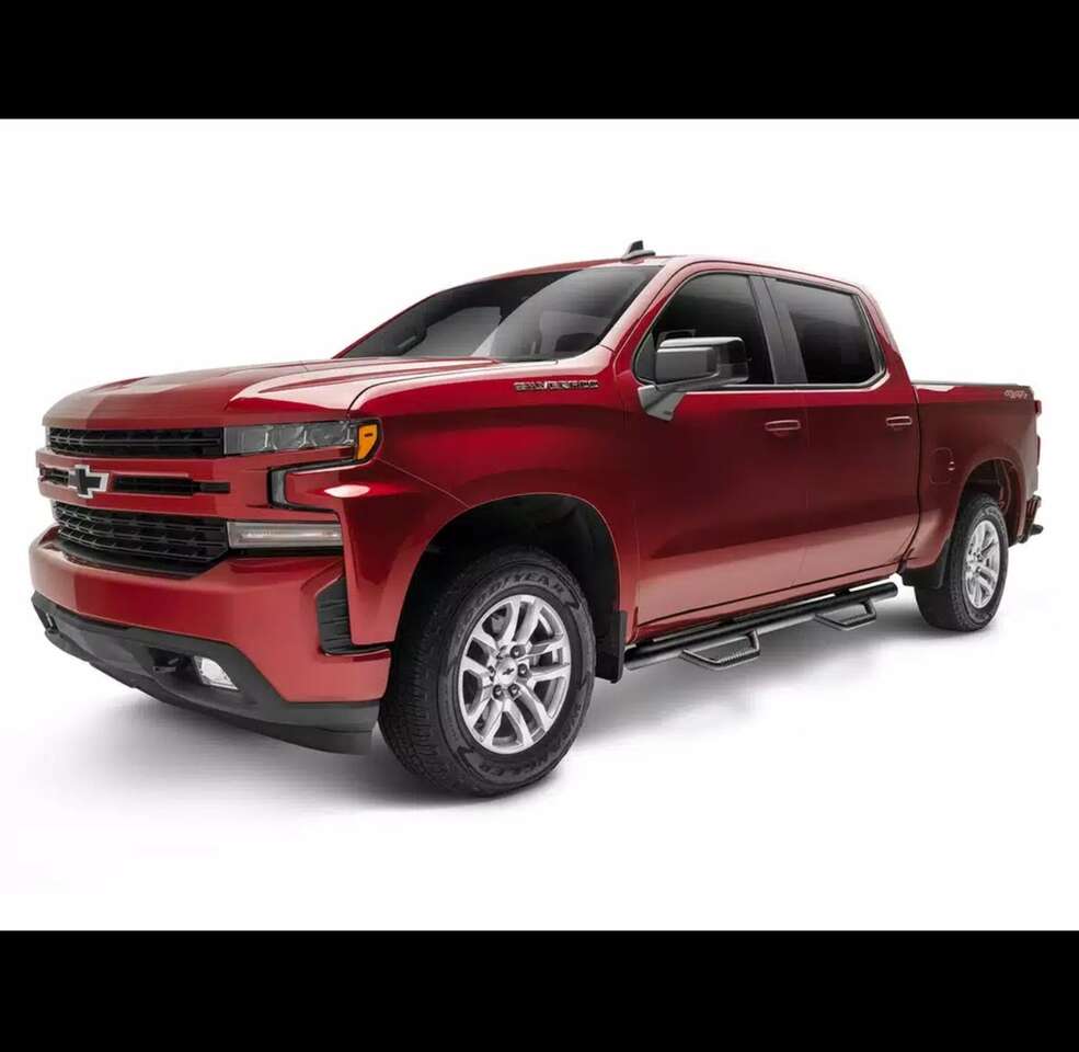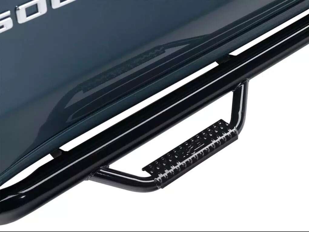 Description- Cab length Nerf bar steps for 2019-2024 Chevrolet Silverado/GMC Sierra 1500 and 2000-2021 Chevrolet Silverado/GMC Sierra 2500/3500 DOUBLE (all bed lengths) in gloss black finish with installation, hardware kit. See photos for more product information and specifications.