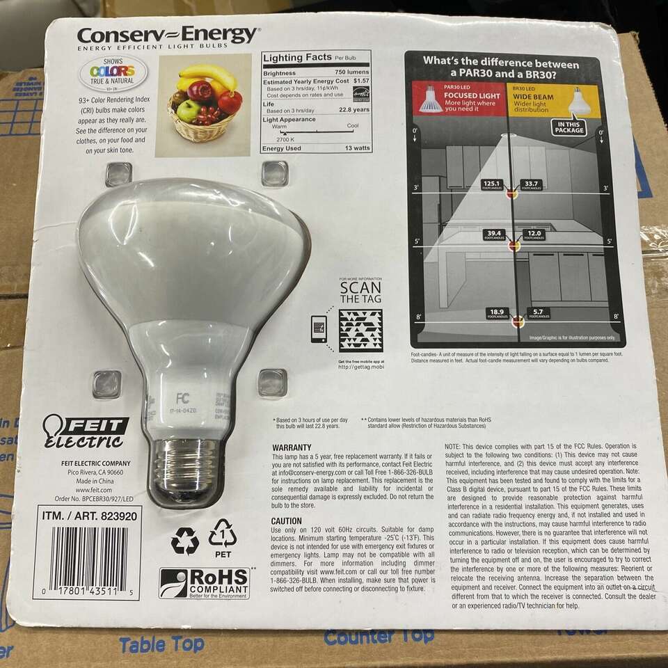We have a small number of these Feit Electric 13Watt for 65 Watt Replacement BR30 Dimmable LED Flood Lights model BPCEBR30/DM/LED #12379 available. These flood lights come to us in various conditions from New in package to Lightly Used out of package. We inspect and test any opened or out of box light to make sure that it is in good working conditon.