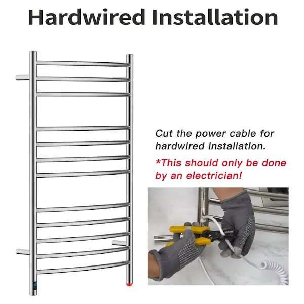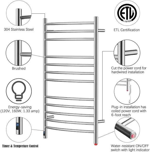 Brand HEATGENE Installation Type Wall-Mounted FUNCTION UPGRADE: On the basis of the HEATGENE model HG-6441 classic series towel rack, a built-in visual TIMER and TEMPERATURE CONTROL SWITCH are added, which make the product easier to use and more energy-saving, a large 12-bar curved design is convenient for hanging multiple towels on it at the same time. NOTE: Built-in Temperature Control shows temperature in ℃ (Celsius) EASY INSTALLATION: This space-saving wall-mounted towel warmer offers two ways of wiring (hardwired/plug-in). Whether you have a new bathroom or are retrofitting one, our warmers combine practicality & decoration, you should not miss out ENERGY-EFFICIENT: Rated power 160W, it warms up within 15 minutes and reaches the optimal working temperature 130 °F (based on room temperature 68 °F) in an hour, 12 maintains constant temperature curved hanging bars evenly distributed to increase heat density for a larger heated area to meet the needs of the whole family, you can enjoy your warm towel at any time RELIABLE QUALITY: An ETL-certified towel warmer with a constant temperature of 130 °F, which provides warm towels at all times. Overheat protection ensures safety from excessive temperature TWO-YEAR COVERAGE: Enjoy peace of mind with two years of coverage provided by the manufacturer's plan.