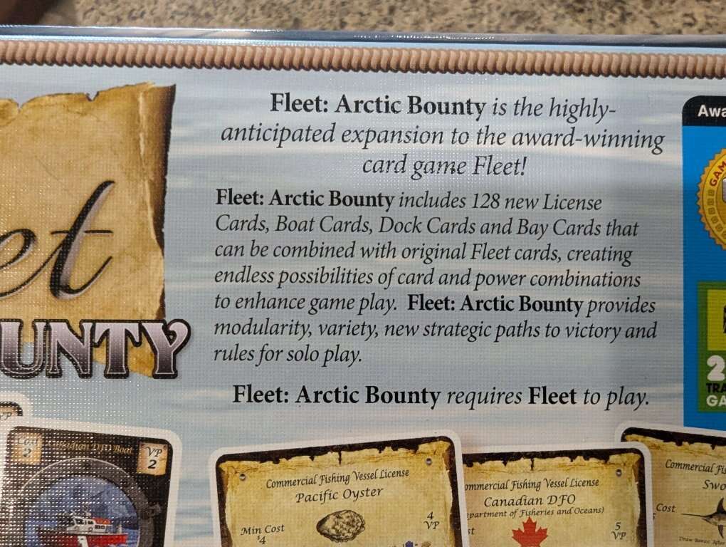 Fleet: Arctic Bountyexpands the award-winning card gameFleetwith 120+ new cards including: New Premium Licenses, Base Licenses, and Boat Cards with all-new bonuses New Dock cards with more ways to build your Fleet All new Crewman cards and Gone Fishin' Brand new one-player and two-player variant cards and rules An updated rulebook