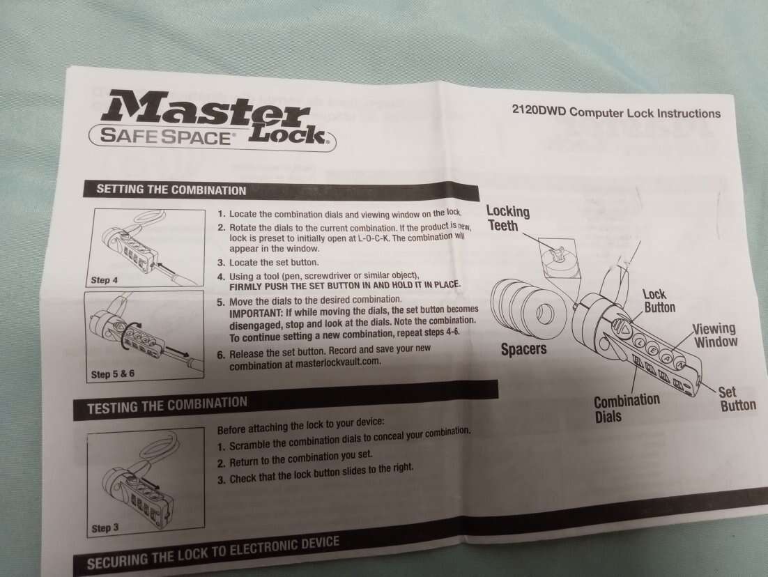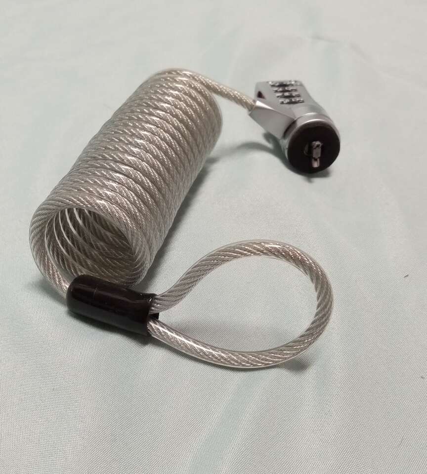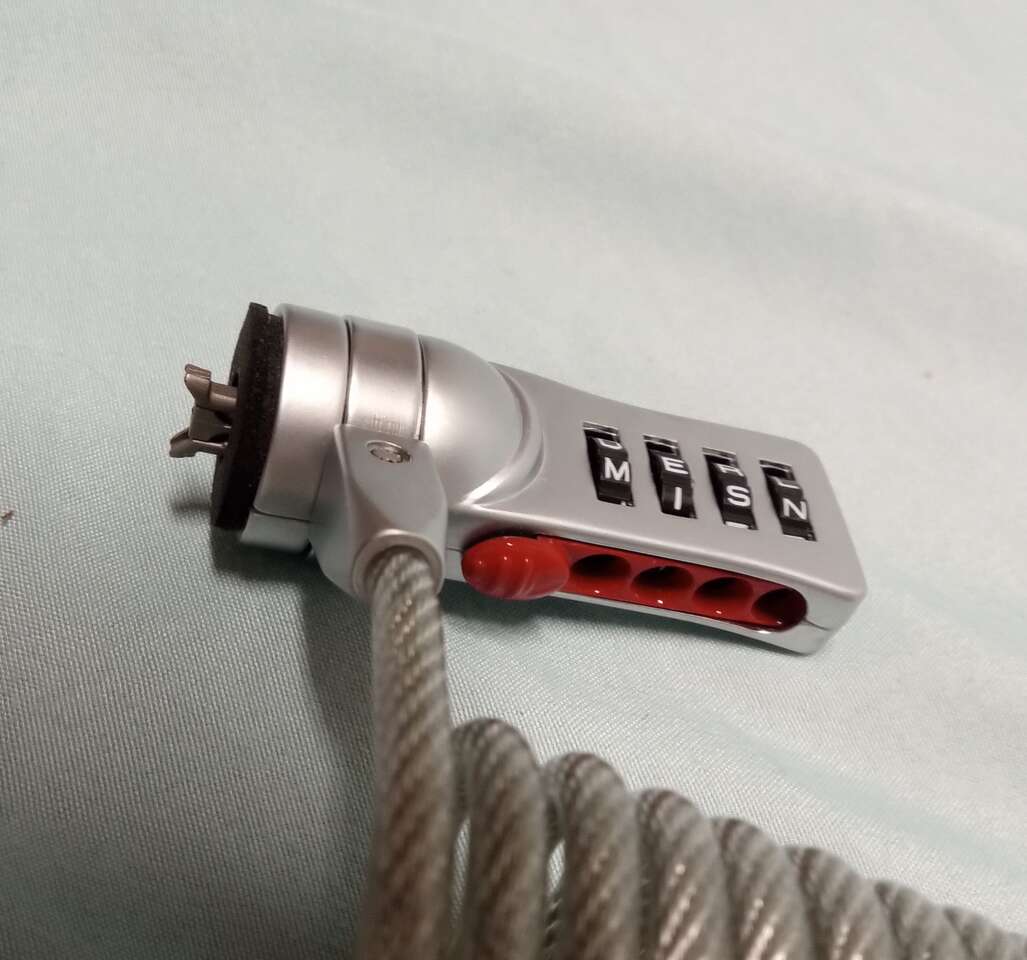 Master Lock brand computer / laptop lock. Apparently laptops have some port in the side that this inserts into. The loop on the opposite end can be put around something. Once secured, no one can disappear your laptop. Great for college. You can set the combination to any of your favorite 4-letter words, like LOAF or TOTS or DRAT, of course. Instructions included. Excellent condition. $5. Cash or venmo. Check out my other listings!