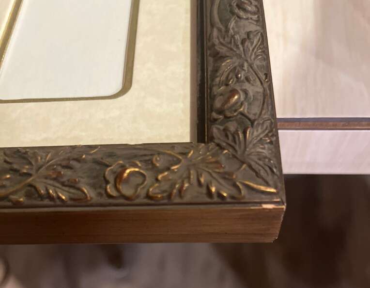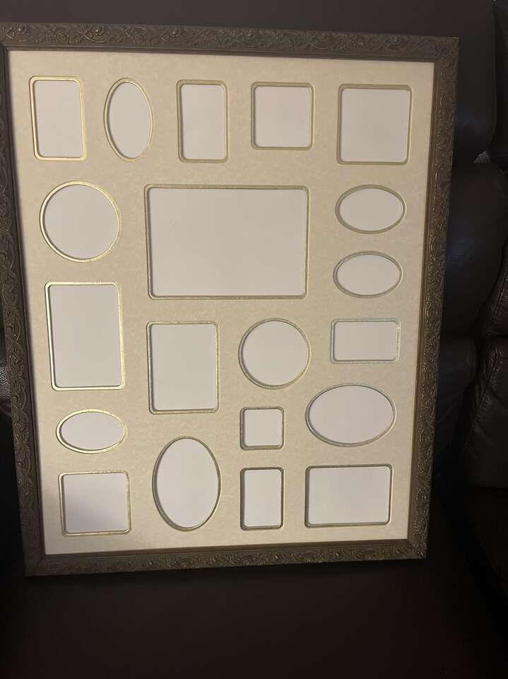 17.25” x 21.25” x 1” 20 openings framed w gold Cream colored setting Beautiful raised design on frame No glass protection for pictures