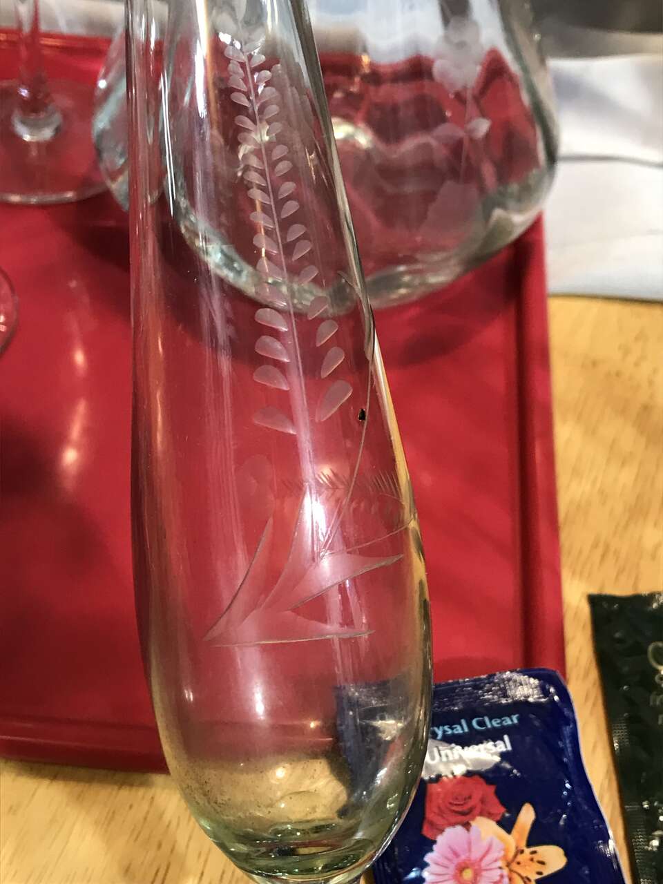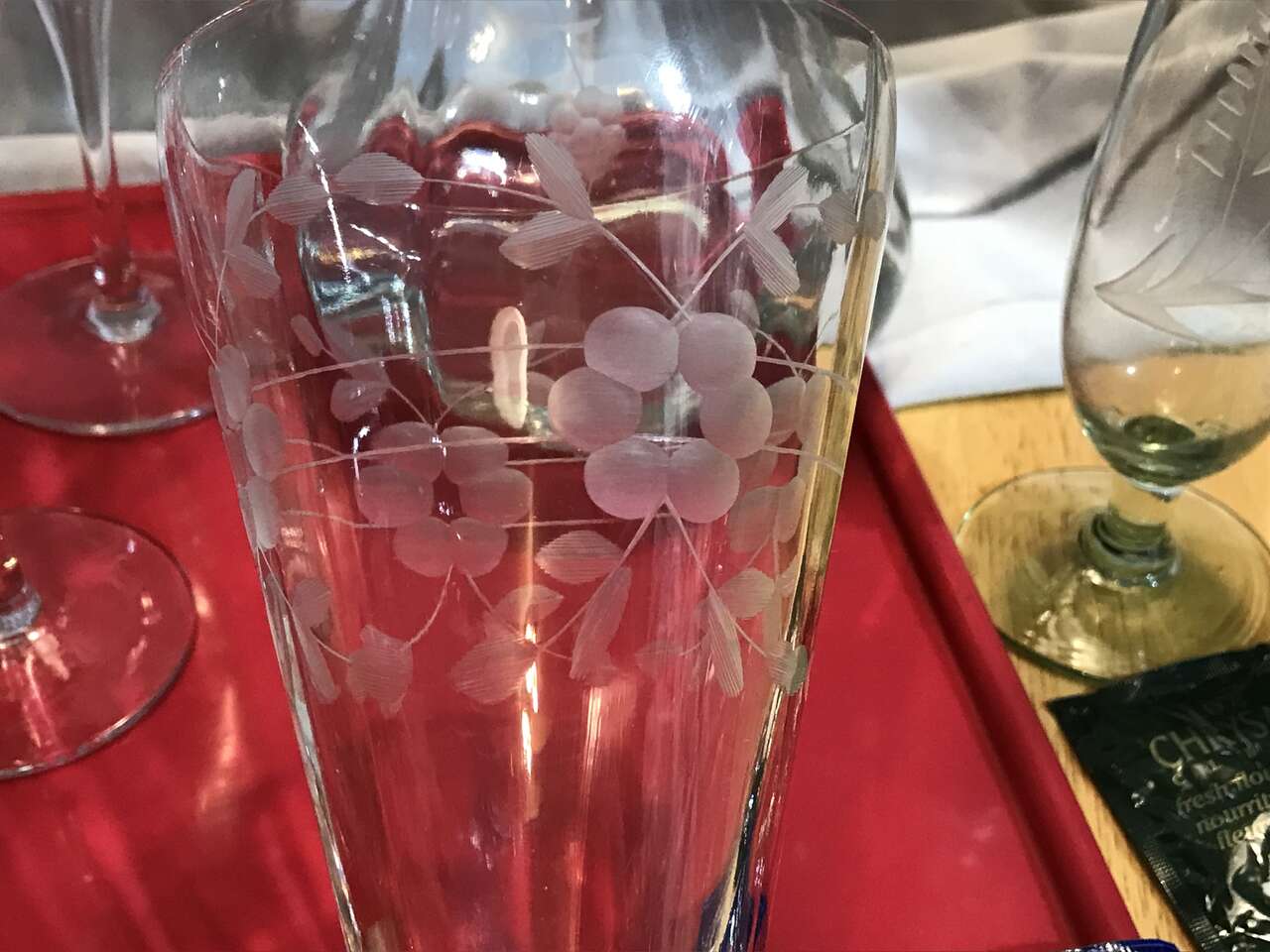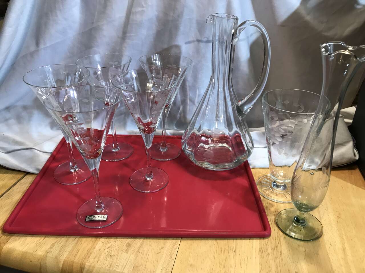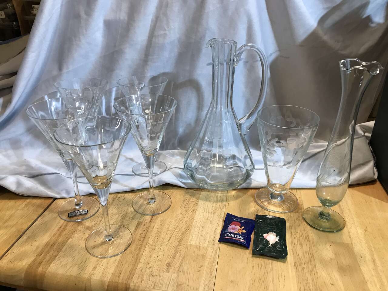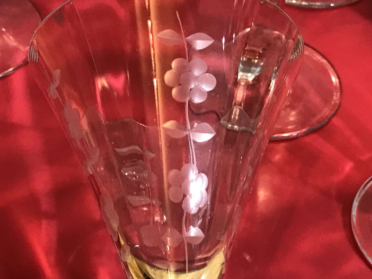 Colony Romania Hand Made Beautiful Flower Etched Wine Glasses (6) vase and Decanter.