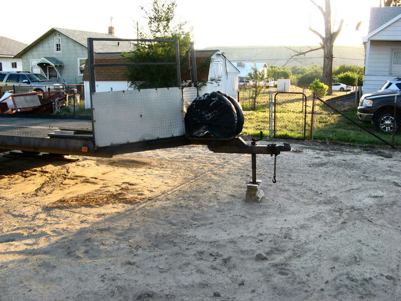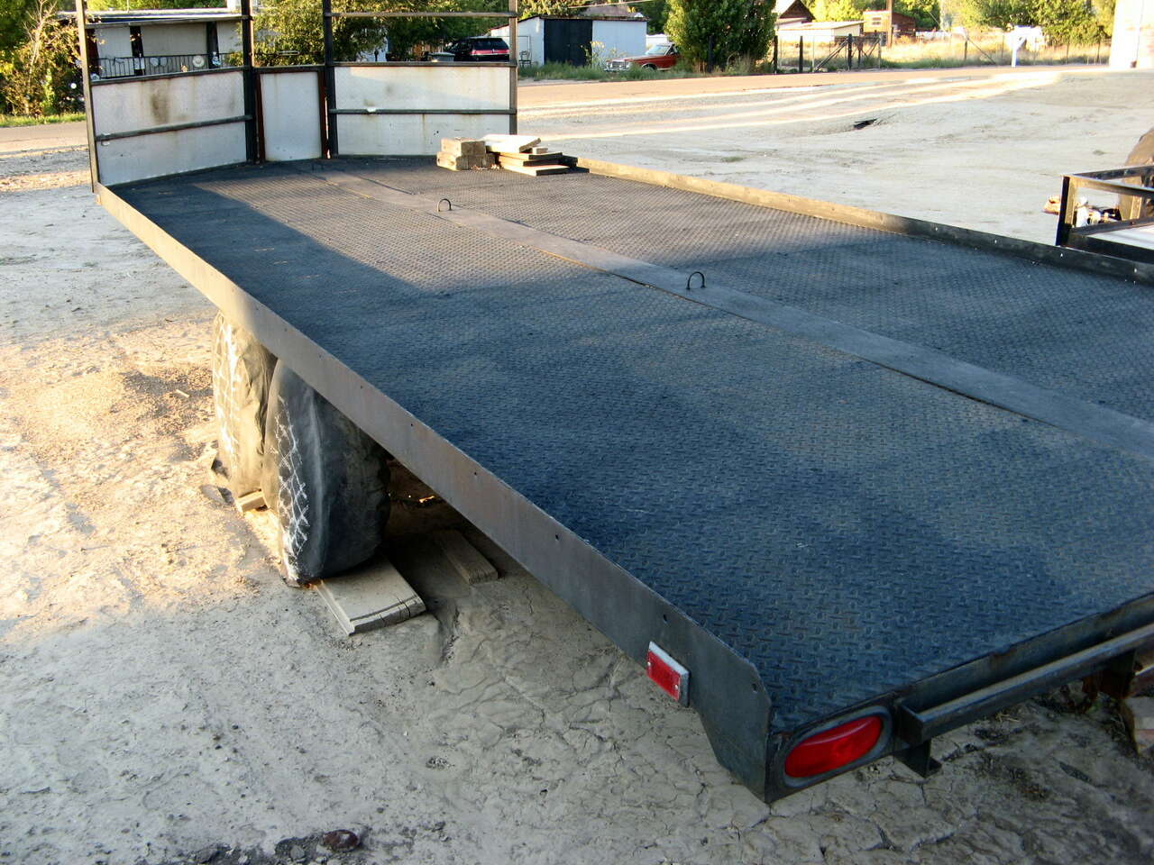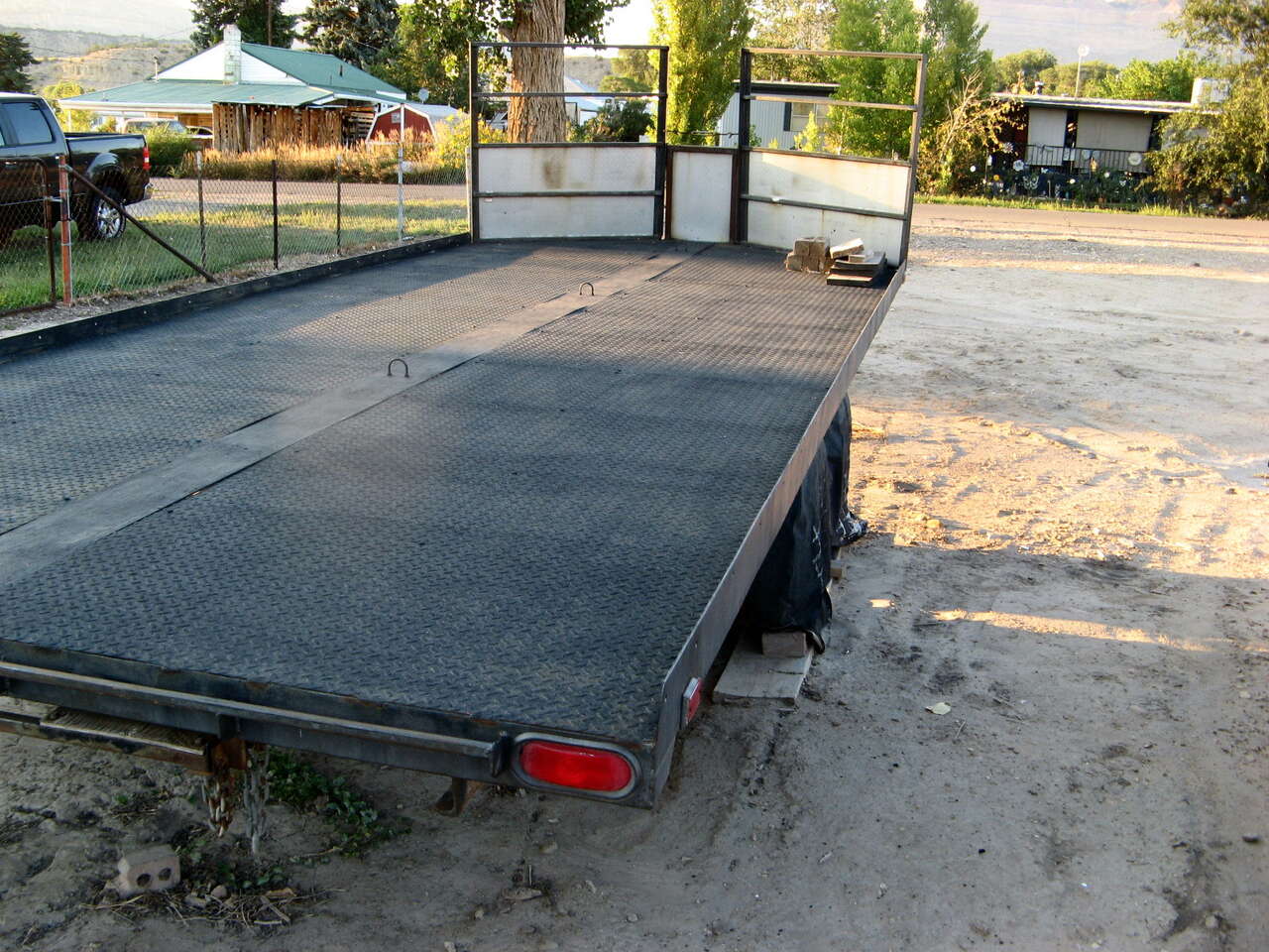 20' BLACK, STEEL ATV/SNOWMOBLE/UTILITY BUMBER PULL FLAT BED TRAILER. 8' WIDE WITH 3' STEEL LIP ABOVE DECK. RINO COATED STEEL CORAGATED DECKING WITH DRILLED TIE-DOWN HOLES. PLUS TIE RINGS IN CENTER. 2" HITCH, 4' 5" TONGUE. DECK SITS 28" FROM GROUND. SIDE HAND CRANK. PULL OUT 8" X 4" RAMP UNDER DECK. TIRES (4) AND SPARES (2) WHERE PURCHASED NEW IN 2018 AND HAVE LESS THAN 600 MILES USE ON THEM. TIRE SIZE IS 175/85D 14.5. LENGHT OF TRAILER DOES NOT INCLUDE V SHAPE FRONT. BOTH FRONT SIDES FOLD DOWN FOR RAMPS . THIS HAS HEAVY DUTY MOBLE HOME AXLES AND WAS HOME MADE. NO ELECTRIC BRAKES. STORED ON WOOD AND TIRES ALWAYS COVERED. CONTACT ALAN AT 435-472-3033 OR AJSILLITOE@EMERYTELCOM.NET