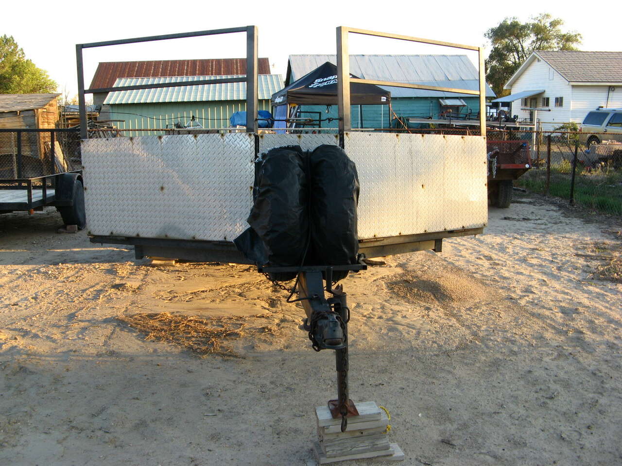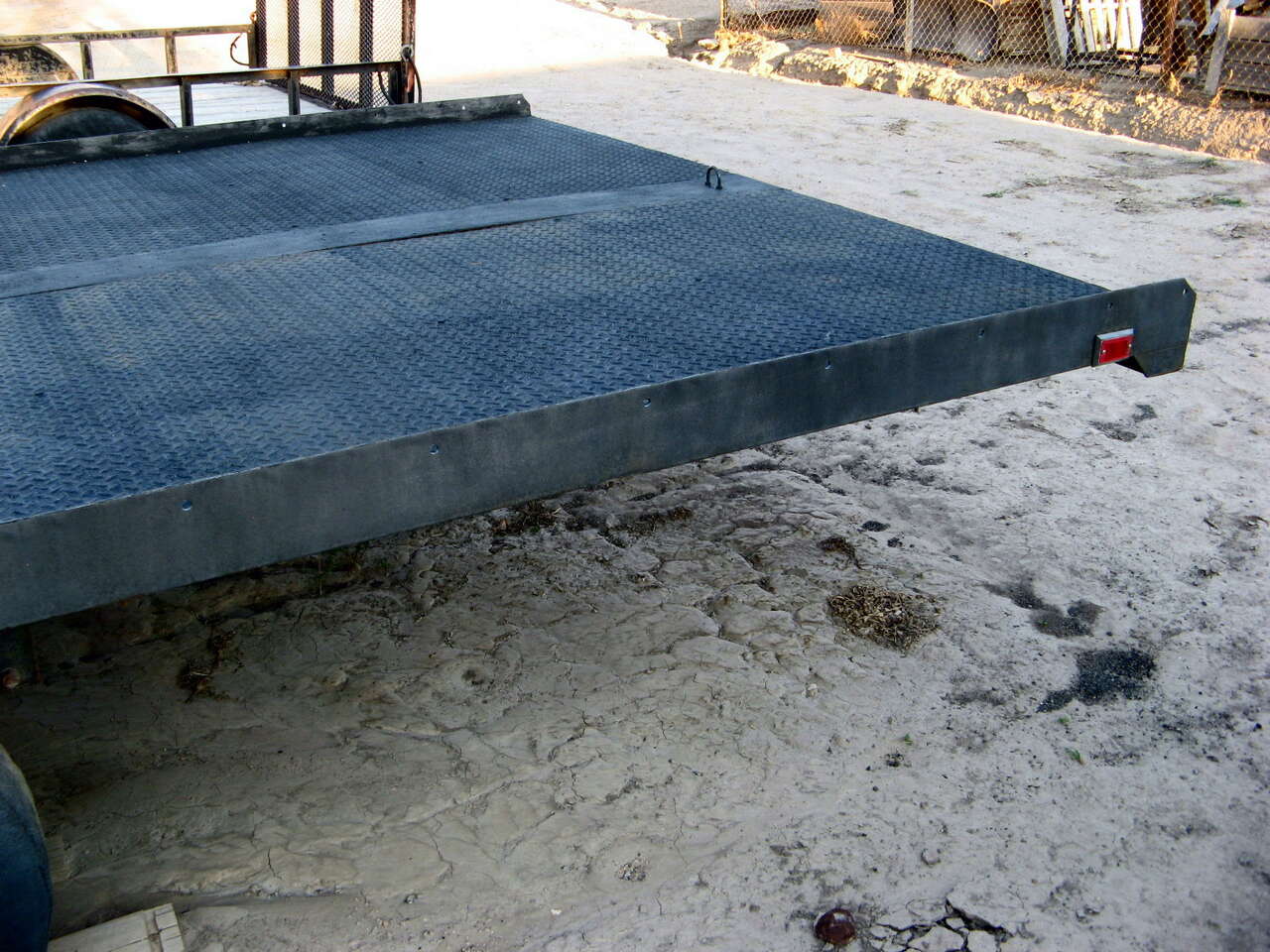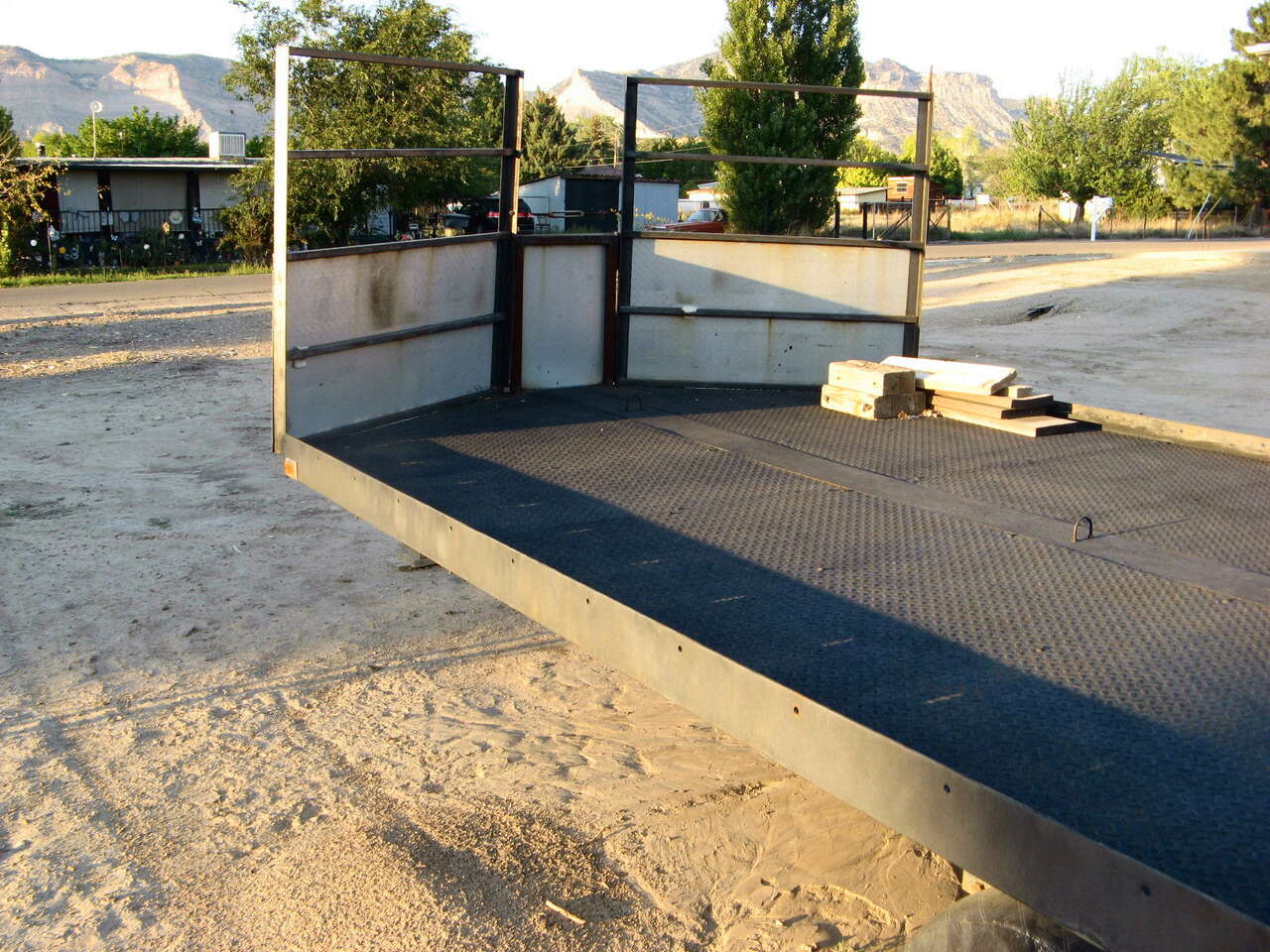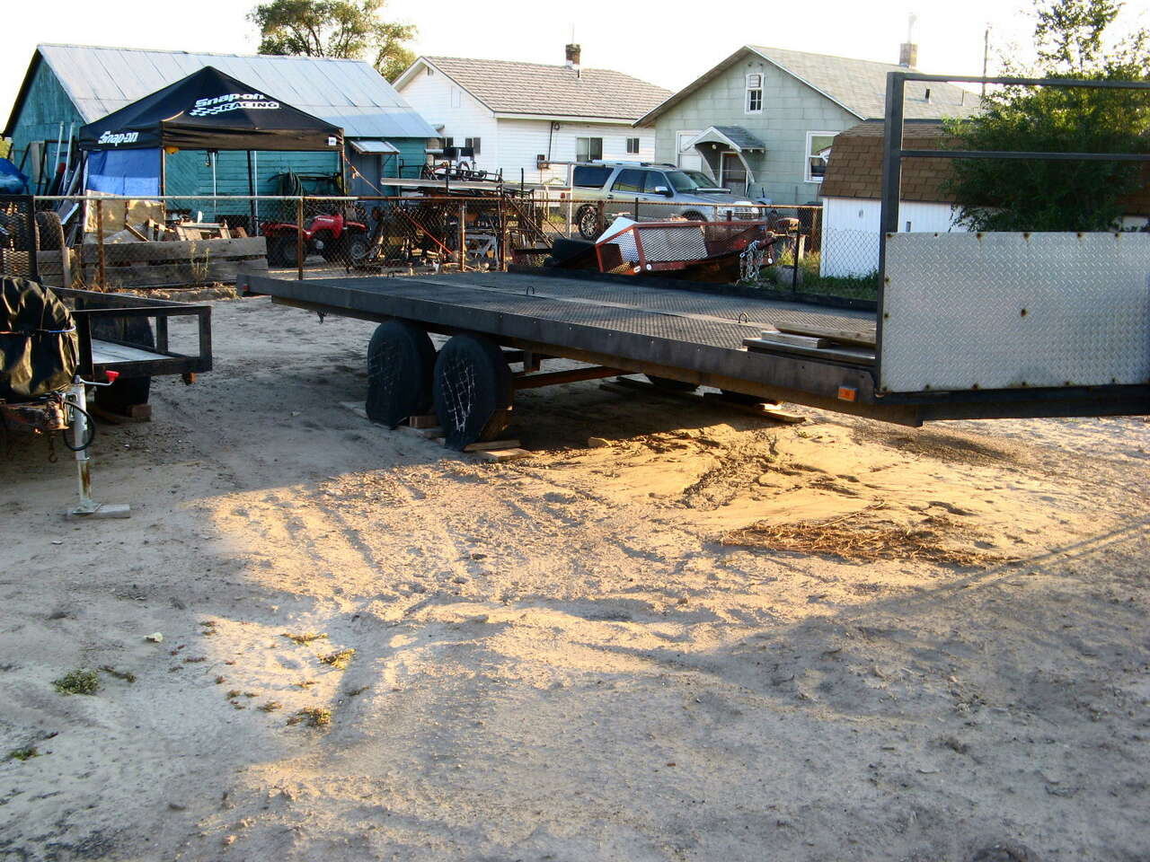 20' BLACK, STEEL ATV/SNOWMOBLE/UTILITY BUMBER PULL FLAT BED TRAILER. 8' WIDE WITH 3' STEEL LIP ABOVE DECK. RINO COATED STEEL CORAGATED DECKING WITH DRILLED TIE-DOWN HOLES. PLUS TIE RINGS IN CENTER. 2" HITCH, 4' 5" TONGUE. DECK SITS 28" FROM GROUND. SIDE HAND CRANK. PULL OUT 8" X 4" RAMP UNDER DECK. TIRES (4) AND SPARES (2) WHERE PURCHASED NEW IN 2018 AND HAVE LESS THAN 600 MILES USE ON THEM. TIRE SIZE IS 175/85D 14.5. LENGHT OF TRAILER DOES NOT INCLUDE V SHAPE FRONT. BOTH FRONT SIDES FOLD DOWN FOR RAMPS . THIS HAS HEAVY DUTY MOBLE HOME AXLES AND WAS HOME MADE. NO ELECTRIC BRAKES. STORED ON WOOD AND TIRES ALWAYS COVERED. CONTACT ALAN AT 435-472-3033 OR AJSILLITOE@EMERYTELCOM.NET