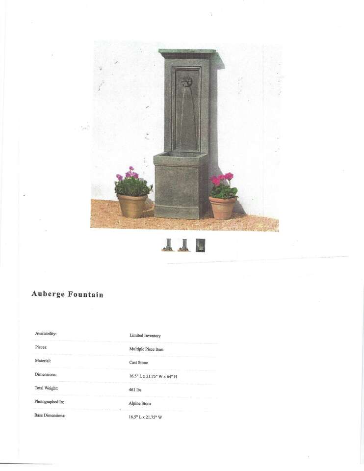 New Auberge Concrete Fountain. We have two available $750 each. 16.5 L x 21.75 W x 64 H. Includes pump. 461 Lbs Price brand new is $1650.00