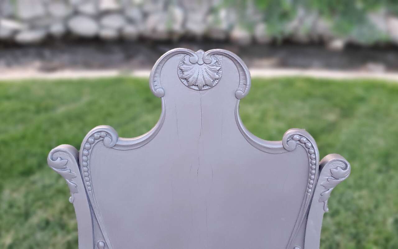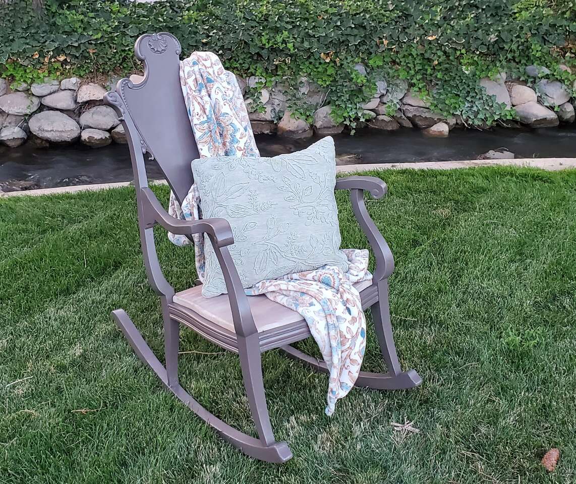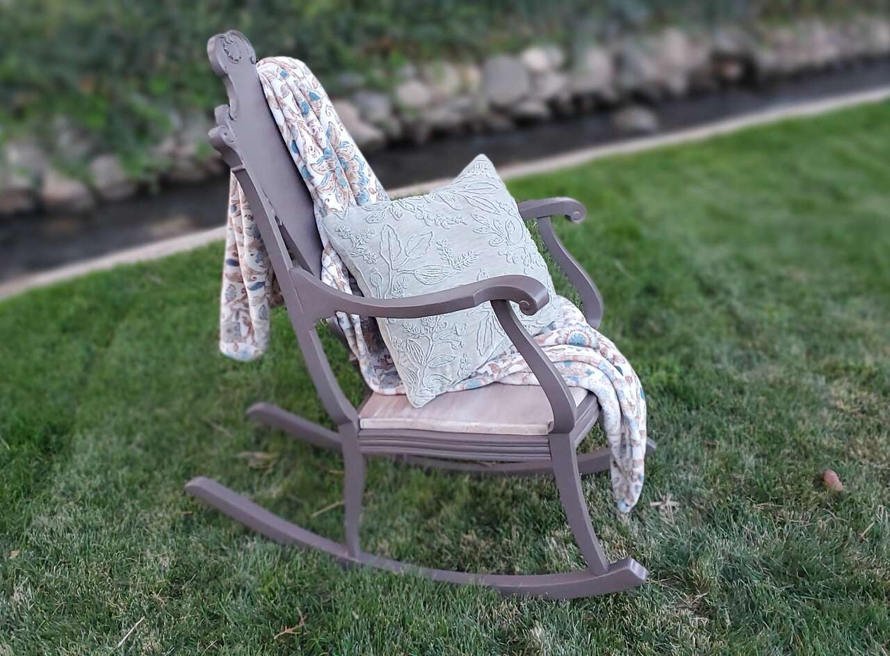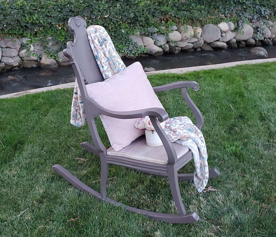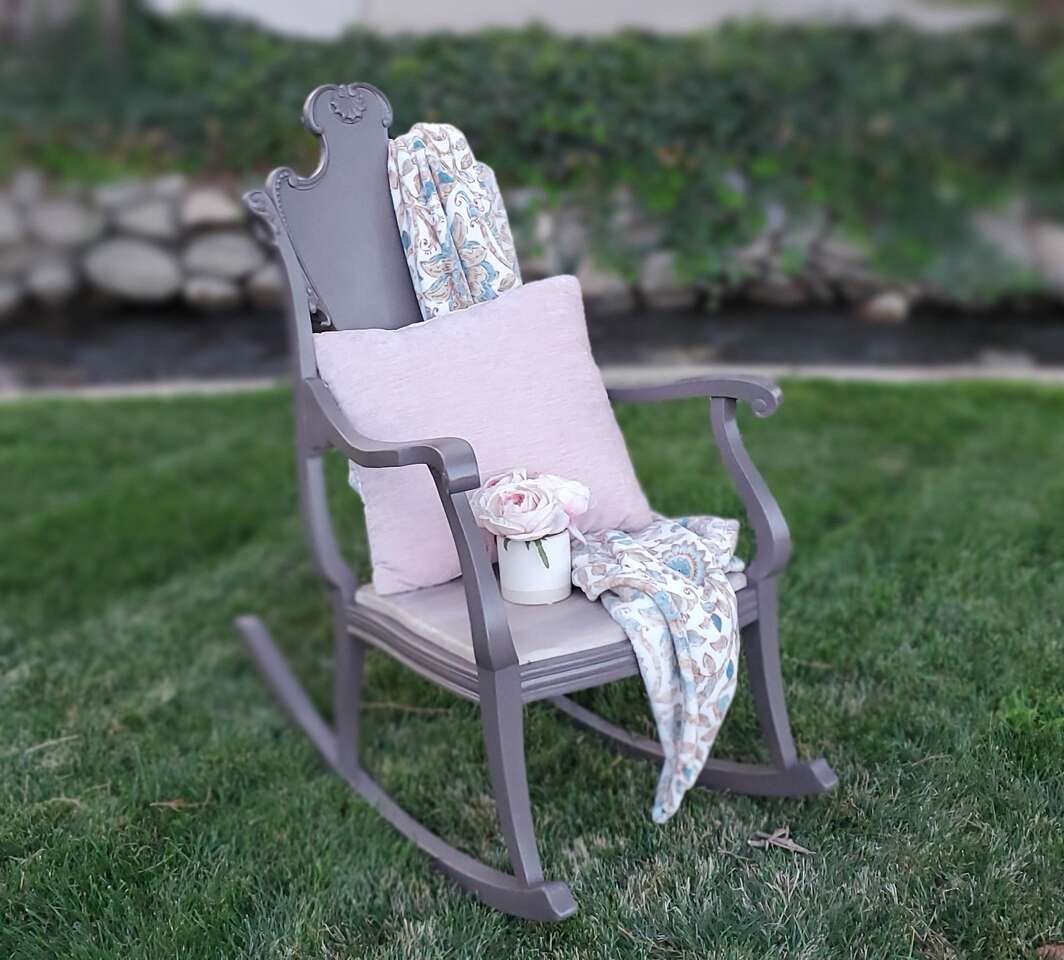 With it's minor nicks, and dents this utterly charming antique rocking chair holds the mysterious secrets of multiple years of gently rocking children to sleep, or rocking people watching sunsets on a porch...If only this chair could talk! It has been lovingly restored to a new look with a fresh coat of London Gray enamel, enhancing it unique shape, and tiny, carved wood details. The newly cut seat of maple wood is white stained, and clear coated with satin enamel. It is ready to serve it's new owners to soothe the tired baby, or tired soul. *Decor not included.