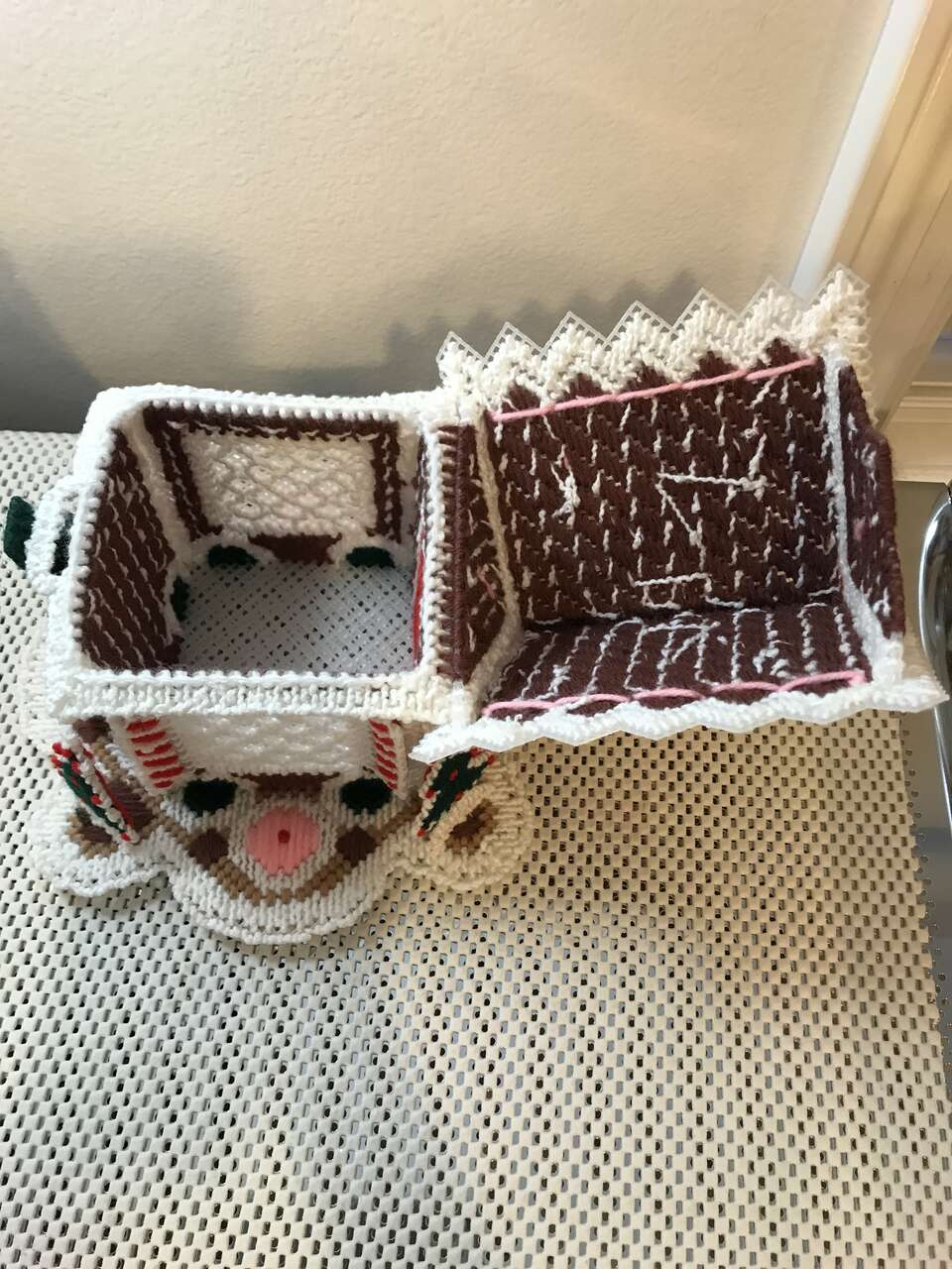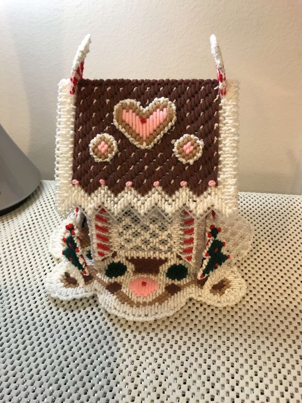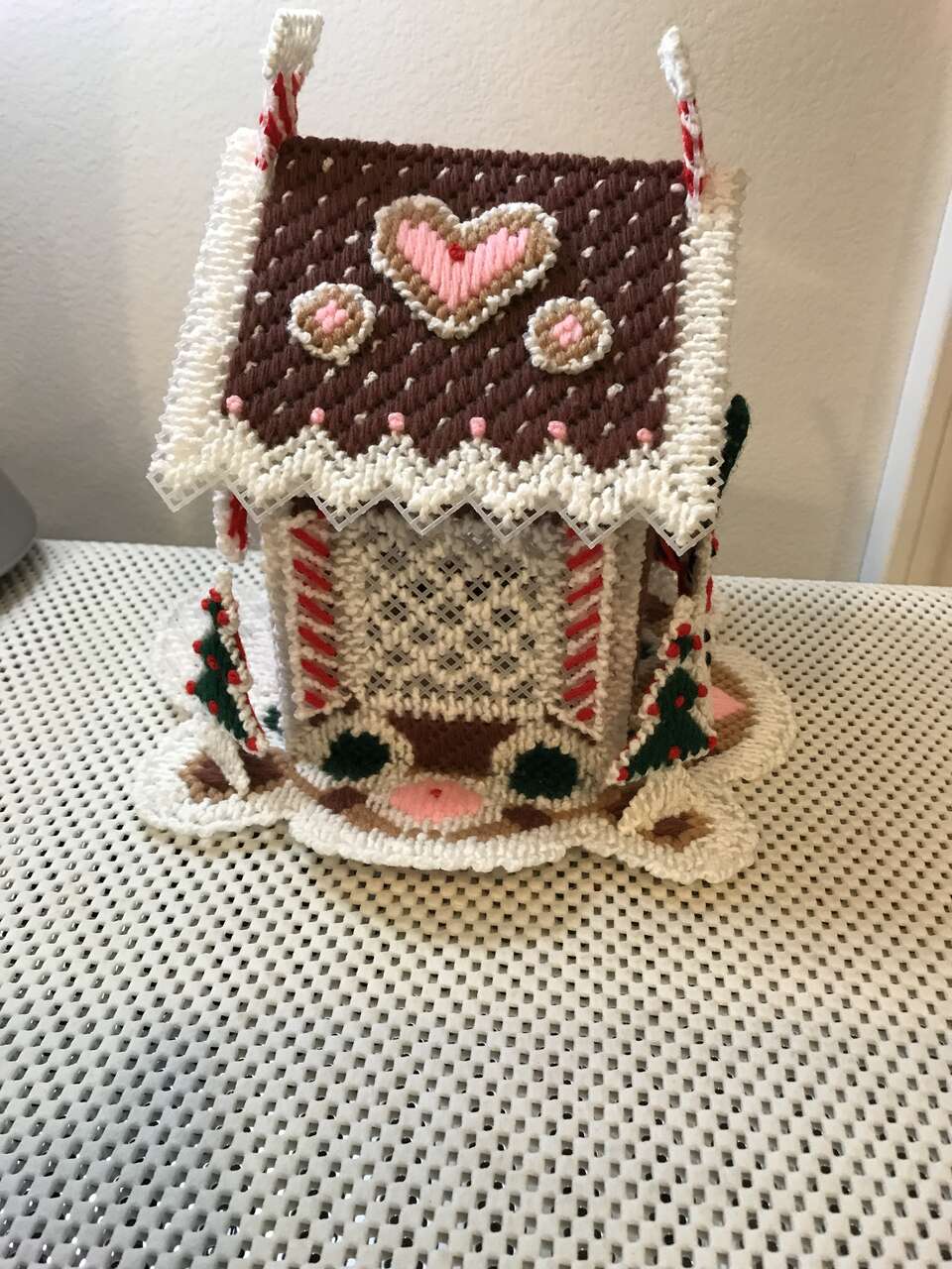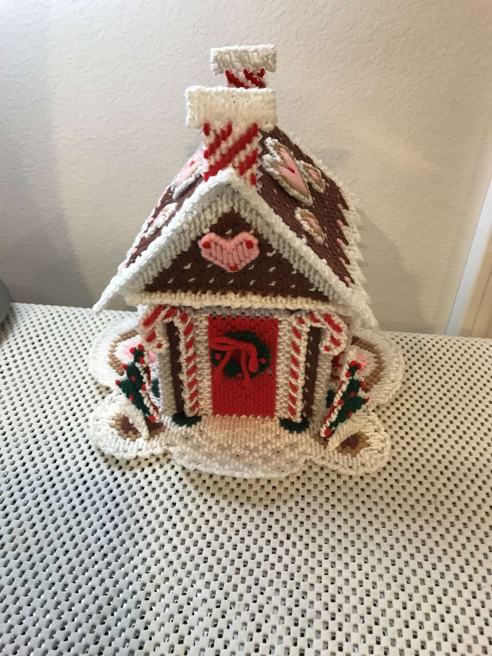 Vintage Gingerbread House Plastic Canvas Handmade from Dick Martin Design Needle Craft 1982. Base is 9" x 9". House stands 9" to top of Chimney. House is a out 4" square.