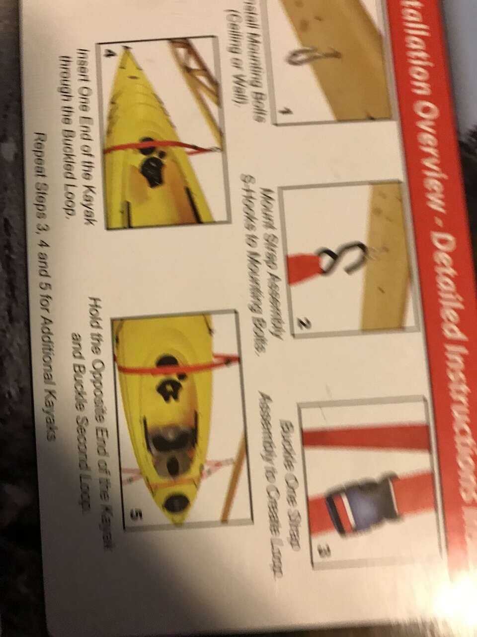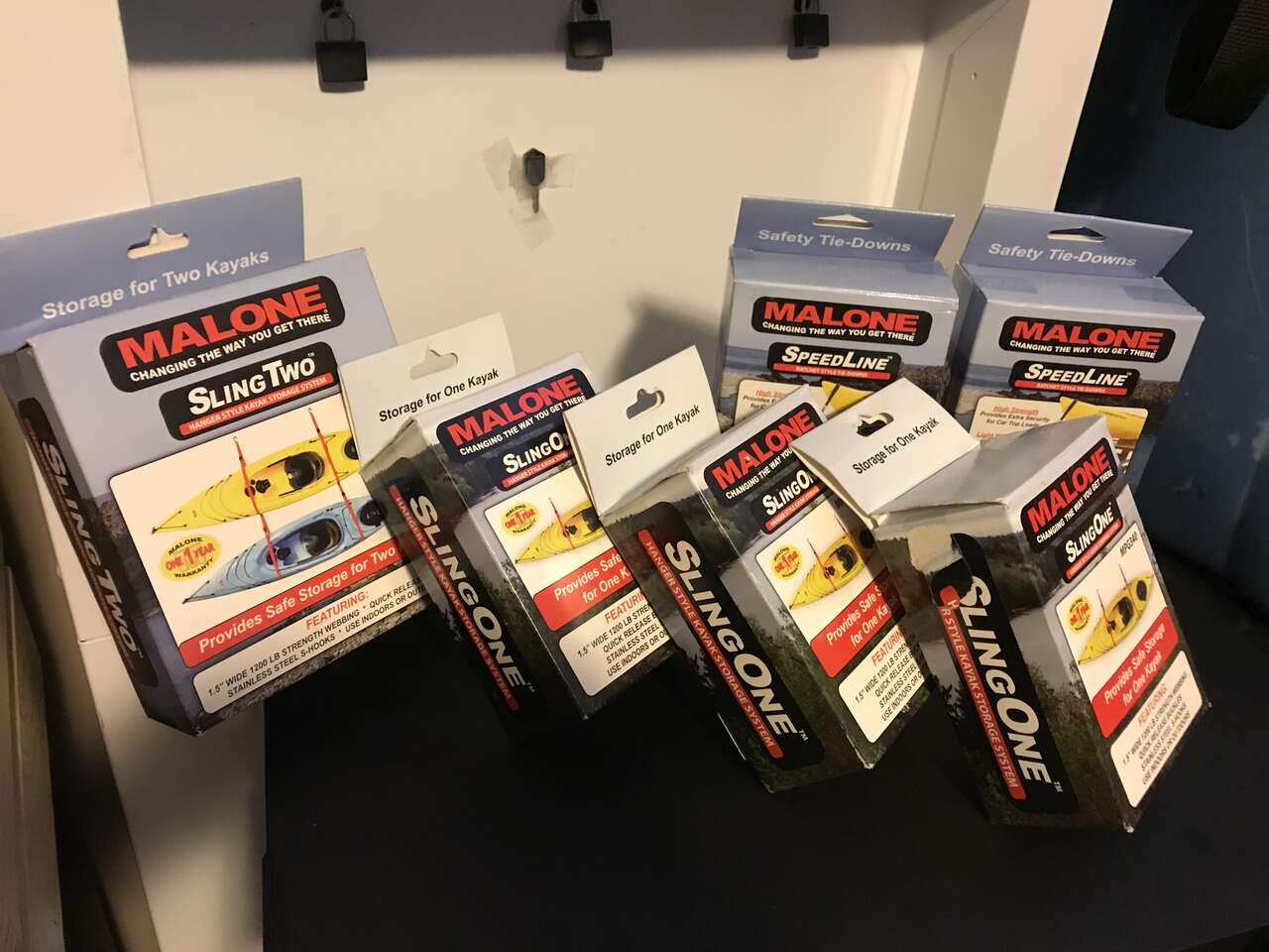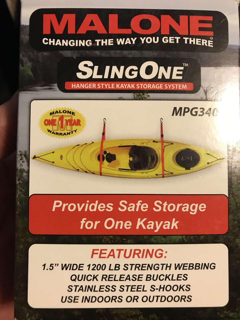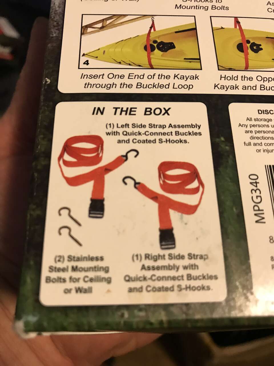 Store one or two kayaks on your garage wall or hanging from the ceiling the single sling kit is $10 a double sling kit is 18.00