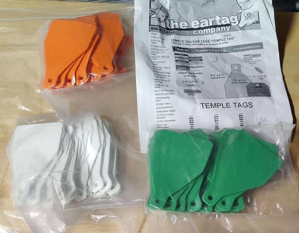 VenmoThese are new ear tags, the white package has been opened, the other two are still sealed. Should be 25 in each package so about 75 tags are included for the price. Plus I found several packages of smaller tags that will be included. Can ship for $20. Pictures should be self-explanatory.