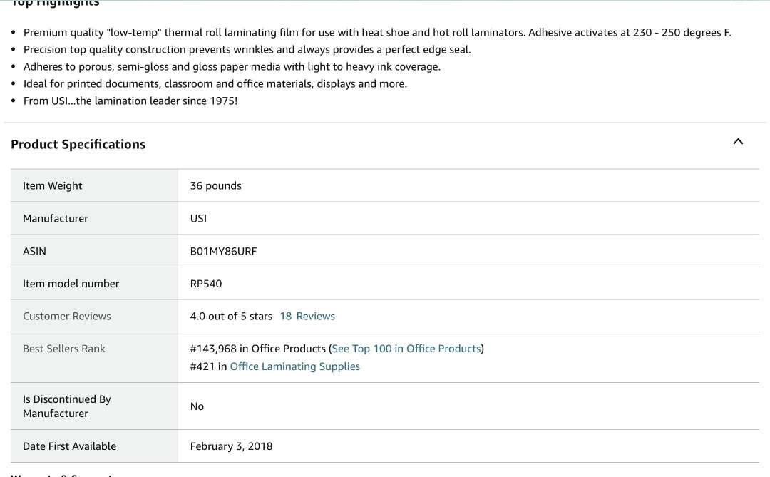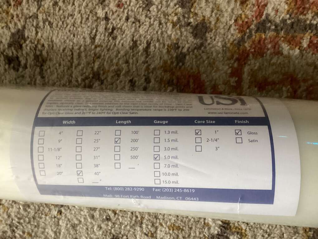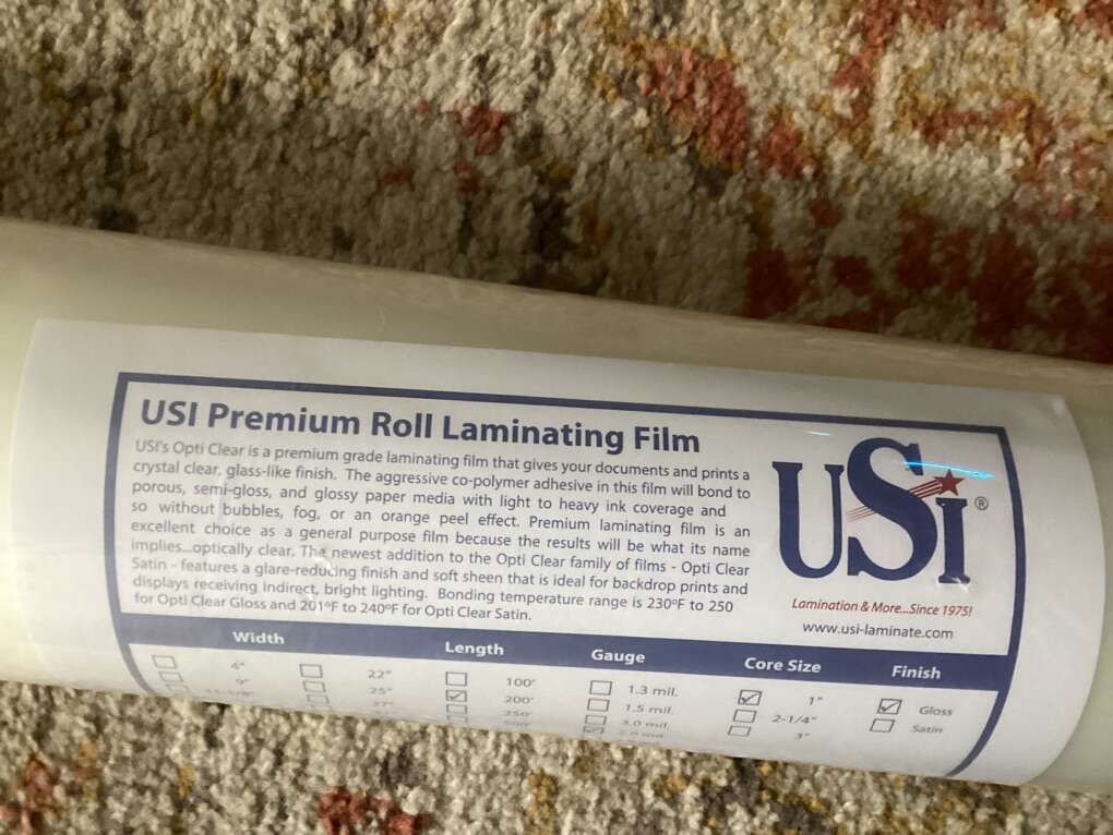 Premium quality low-temp thermal roll laminating film for use with heat shoe and hot roll laminators. Adhesive activates at 230 - 250 degrees F. • Precision top quality construction prevents wrinkles and always provides a perfect edge seal. • Adheres to porous, semi-gloss and gloss paper media with light to heavy ink coverage. • Ideal for printed documents, classroom and office materials, displays and more. • From USI...the lamination leader since 1975!