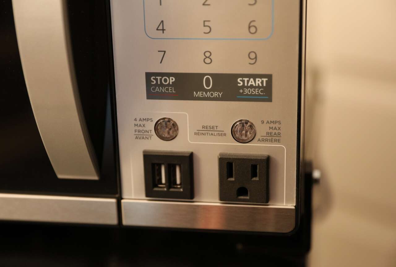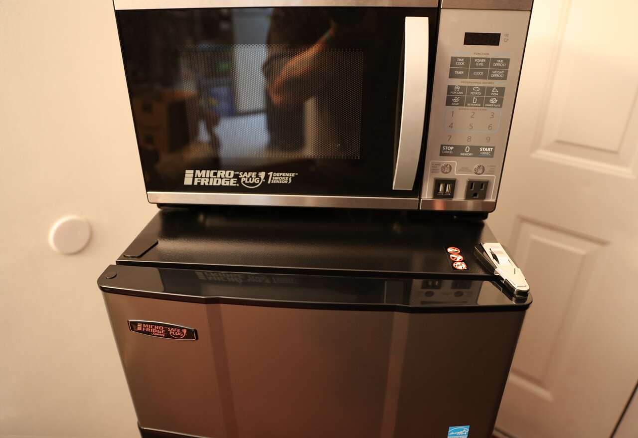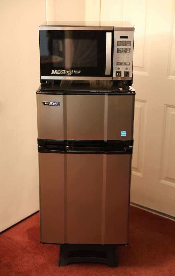 Venmothis is a roommate solution / dorm room slice of heaven! you can charge your cell phone with usb plugs or charge your laptop... maybe place a george forman grill or coffee pot on top, i have never seen plugs on the front of a microwave before. brand new has never been used prior... surplus from extended stay hotel renovation, over 200 units available! 3 cu. ft - two door, top freezer - 44" height X 19" depth X 19" width - bracket fixed/mounted microwave