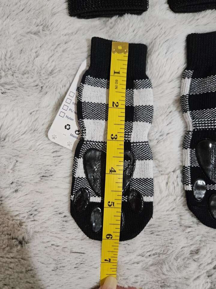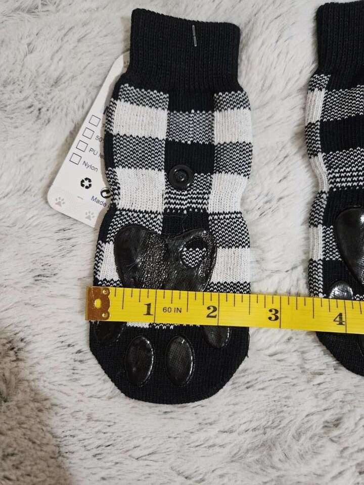 These anti-slip dog socks are new never used. The anti-slip is on both sides of the socks. These also come with a detachable Velcro to adjust the tightness if needed. Please double-check the measurements in the pictures as different brands measure differently. These are 75% cotton 25% polyester. All my items come from a smoke-free home. Any questions please feel free to contact me.