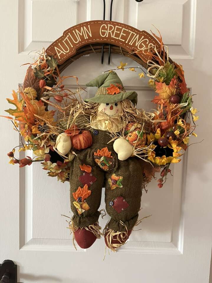Harvest wreath pumpkin sunflower Scarecrow 24” like new in box!