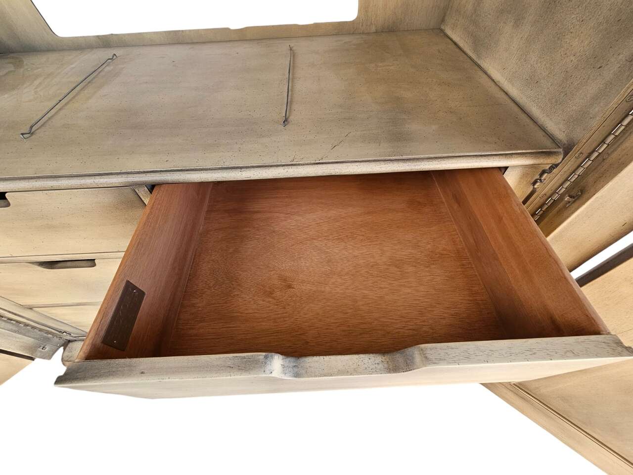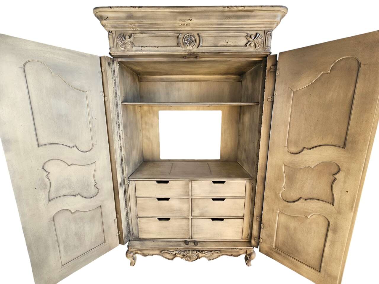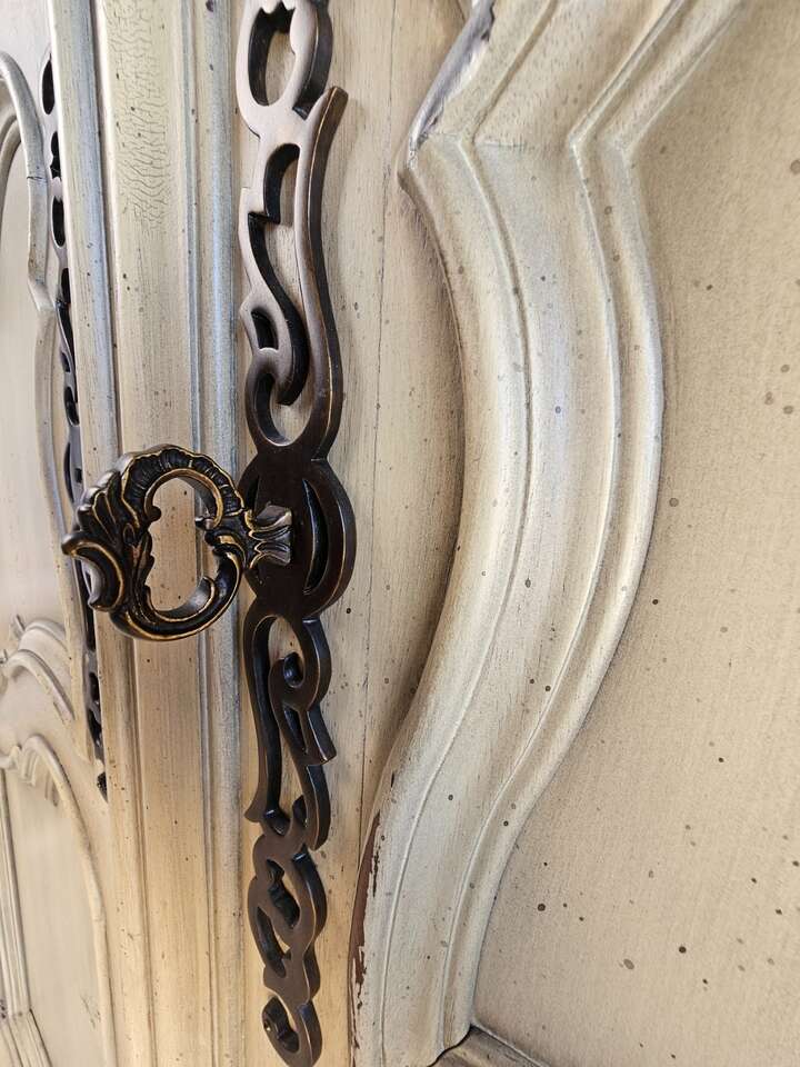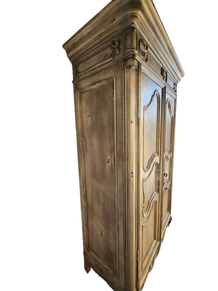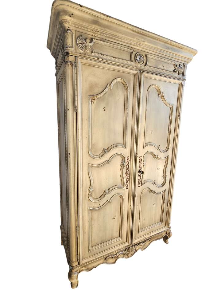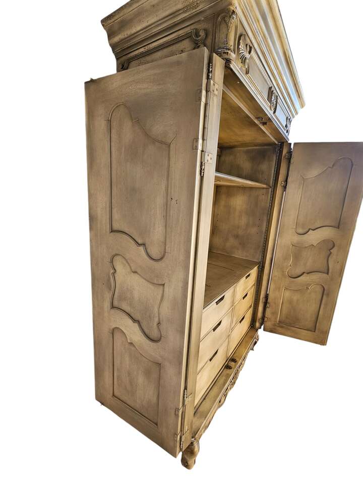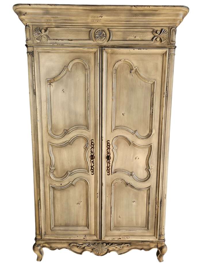 Key Features: • Intricate detailing on doors and panels, adding a touch of luxury • Double-hinged doors that fold flat to the sides for easy access • Spacious storage drawers for organizing your wardrobe or household essentials • Classic yet functional design to complement any room Whether you're looking to elevate your bedroom, living space, or hallway, this Hickory Chair Armoire is the ideal mix of form and function. Don’t miss out on owning a piece of timeless beauty!