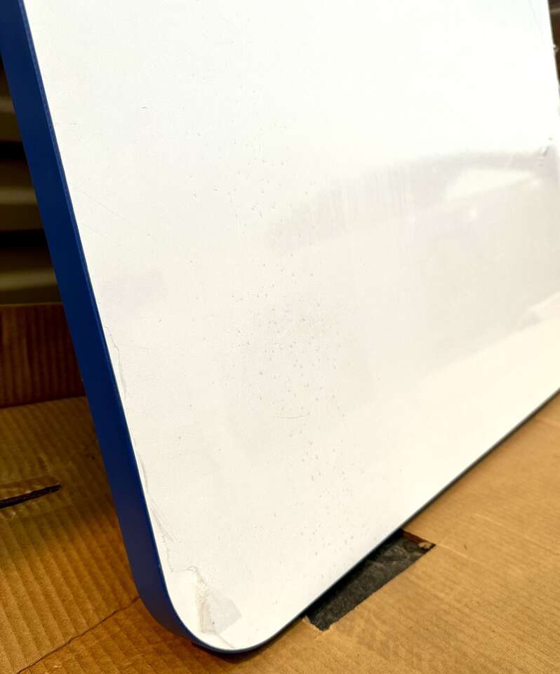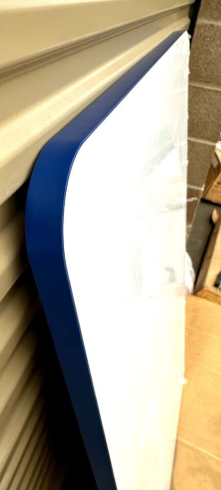 This is a beautiful porcelain enamel table top with a deep blue trim. As you can see in the pictures there is just a little damage on the bottom/underside of the table. Which no one will ever see unless they are scraping the gum off the bottom of the table.. The top is in excellent condition and protected by a film of plastic. Beautiful table top. Asking $150 OBO.