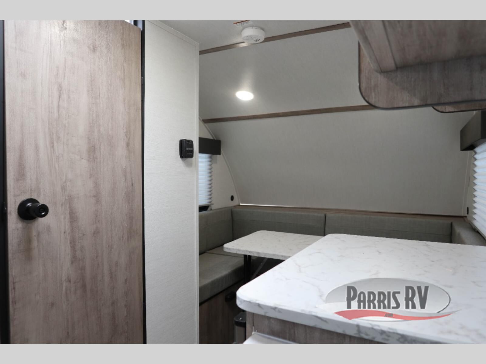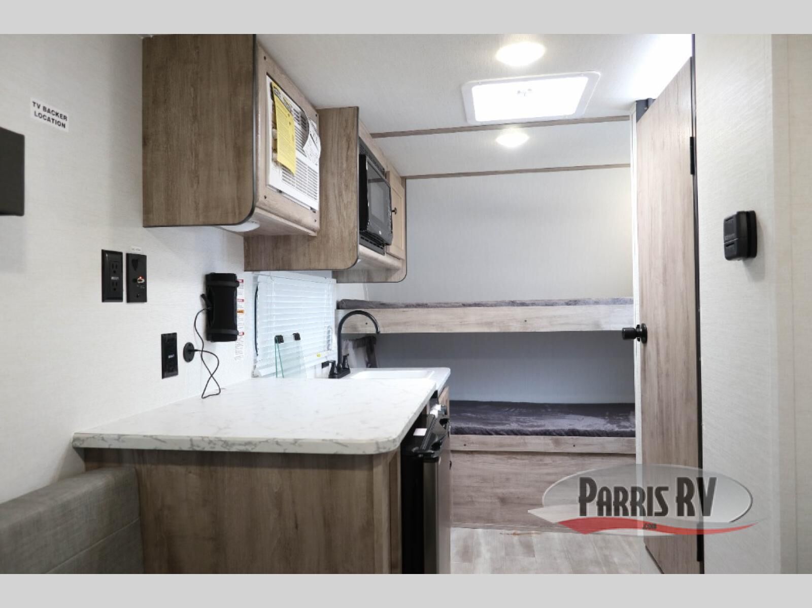 Wherever you decide to roam, you can enjoy at-home comforts with this teardrop trailer! The front bunk beds provide compact sleeping space, and the rear convertible U-shaped dinette will be perfect for eating, game night, and sleeping! A two burner gas cooktop with a glass cover and a microwave oven let you make meals each day, and the gas/electric refrigerator will keep your perishables fresh. You will also appreciate a convenient wet bath with this model, a TV mount if you want to add an optional TV, and a control panel for easy access to your units functions!