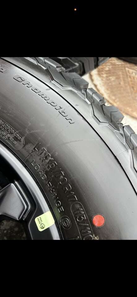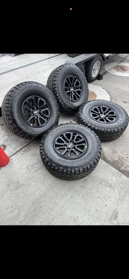 Wheels are 17” OEM wheels off a 2023 ford raptor. Amazing looking wheels, all black OEM raptor wheels. They are in perfect condition. No curb rash, dings or damage. TPMS, lug nuts and center caps are all included. Tires are 315/70/17 bfg KO2, load range C, top of the line tires. No patches or plugs, less then 100 miles so the tires are basically brand new.