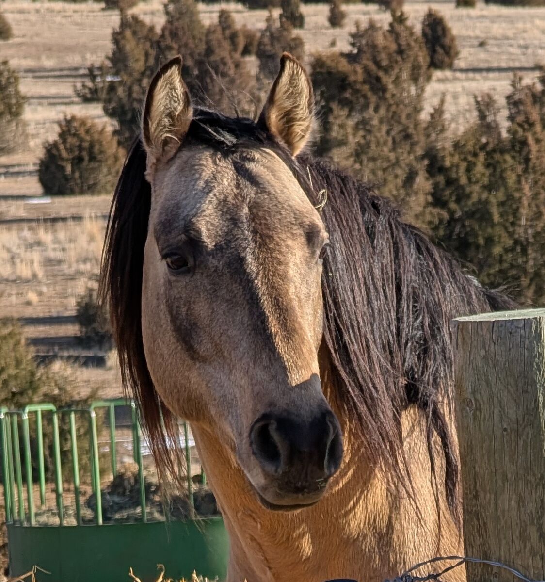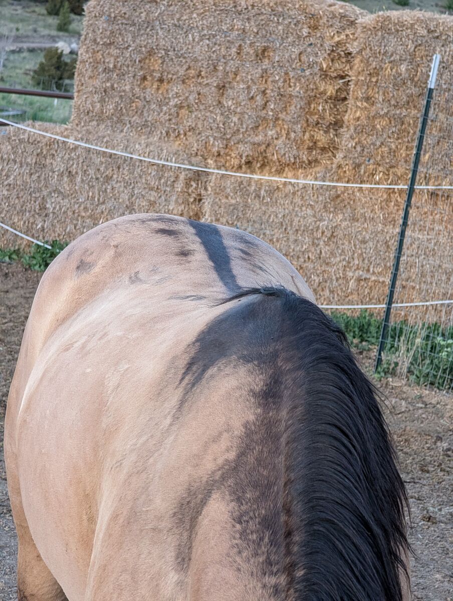 Luey is a buttermilk buckskin dun or better known as a Dunskin, which means he carries a cream gene and dun gene. His "dun factor" is quite significant with barring on the legs, defined back stripe dripping off his neck and spots along his top line.