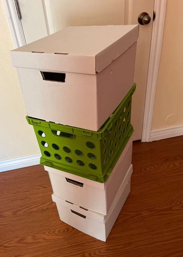 3 white banker boxes and one green plastic storage box/organizer with handles. All in good condition. Great for moving/ storing/ organizing documents/ office supplies/things around the house. $10 must take all.