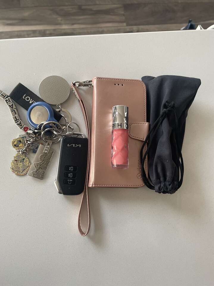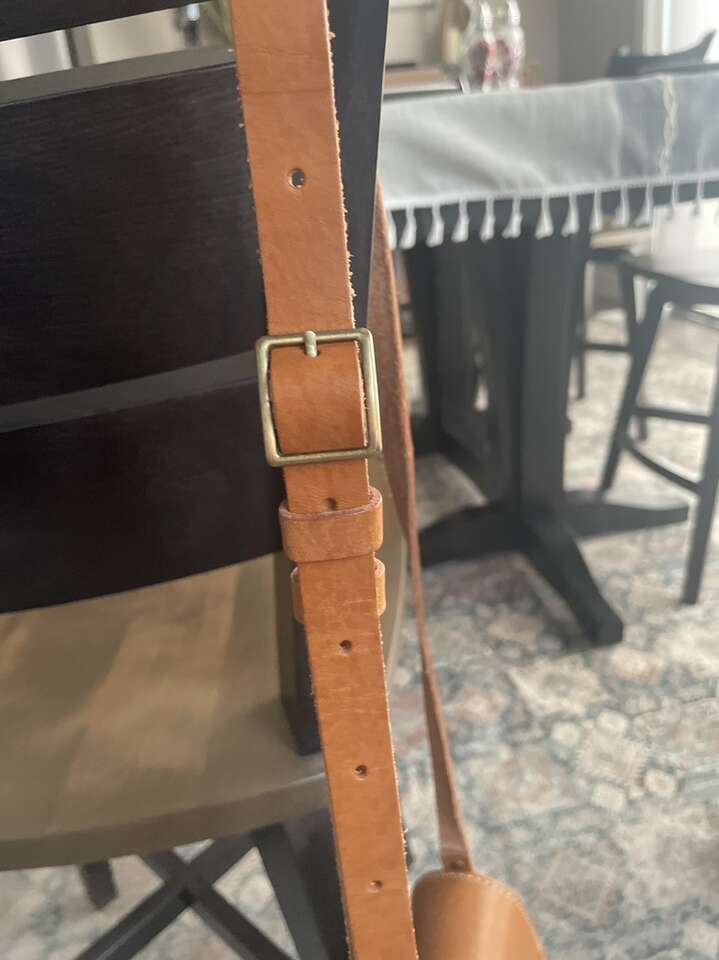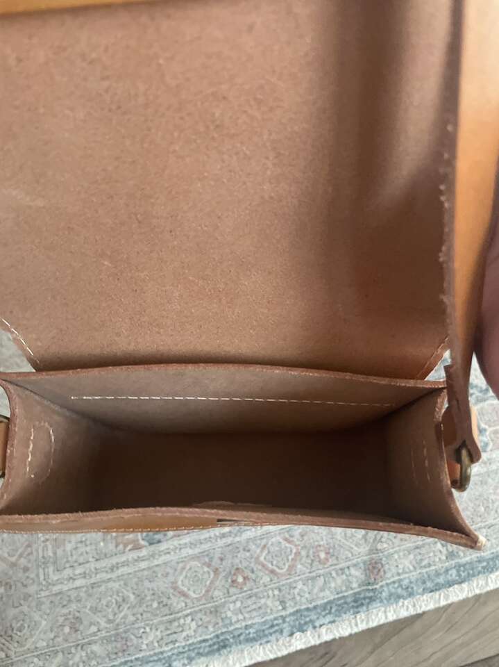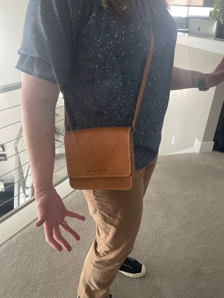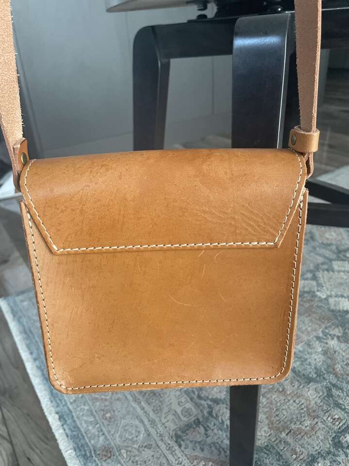 Discontinued style. This adorable crossbody bag is Nearly Perfect, meaning that the leather has some extra flaws. To many, this adds to the character of the genuine leather. Lightly used, the color is a natural honey tone and made of very structured leather that keeps its shape. Features include an adjustable strap and a magnetic snap closure. Exterior measurements: 7.5“ wide and 7” tall, 2” deep. Interior measurements: 6” wide and 5” tall. Fits a large keychain, iPhone 12 with wallet case, lip gloss and reading glasses comfortably inside. See picture.