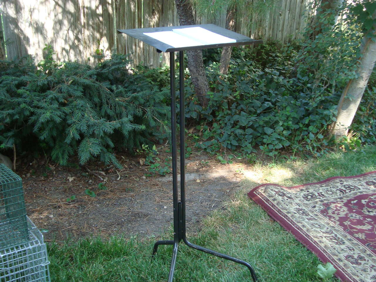 This is a nice solid back Music Stand. Sturdy and made well. It is clean and in great condition. It is not adjustable. Asking $20.