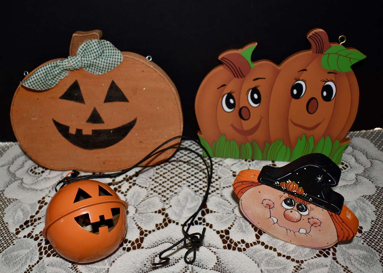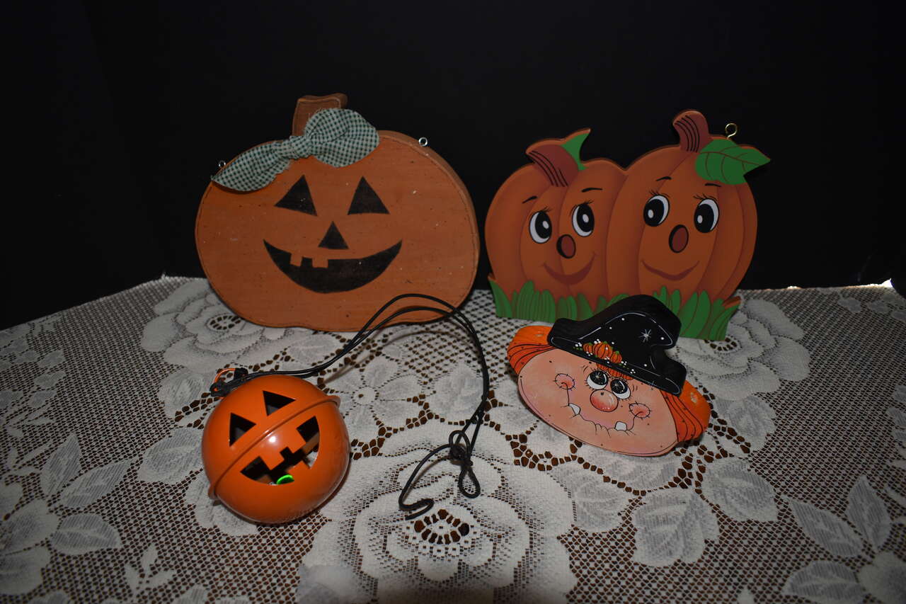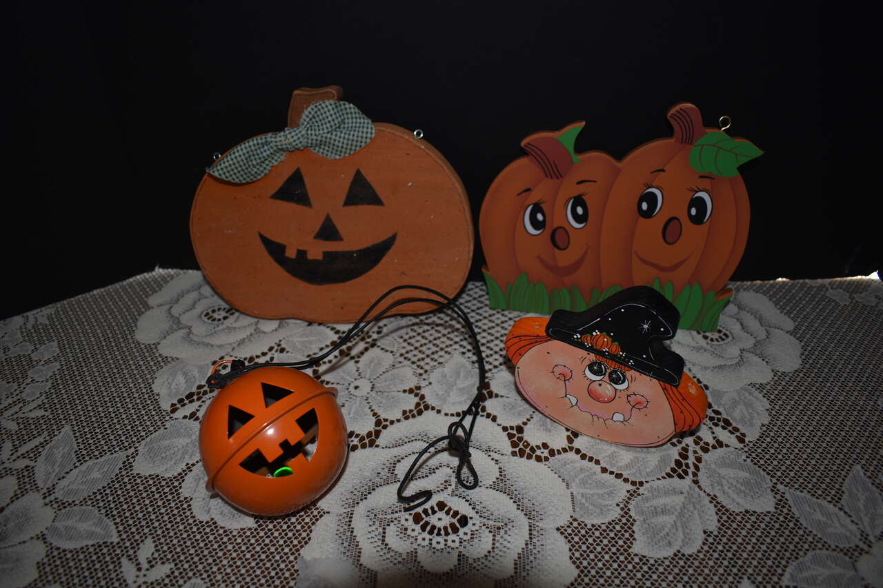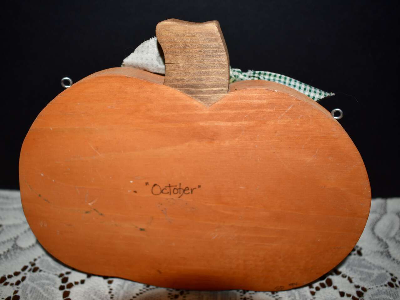 **THEY EACH MEASURE WITH DESCRIPTIONS… *THE LARGEST PUMPKIN HEAD MEASURES… APPROX. 8 INCHES ACROSS MEASURED AT THE WIDEST AREA ACROSS FROM SIDE TO SIDE AND IT IS APPROX. 6 3/4 INCHES LONG MEASURED AT THE CENTER. IT HAS TWO SEPARATE HOOKS FOR HANGING ON EACH SIDE AT THE TOP.
