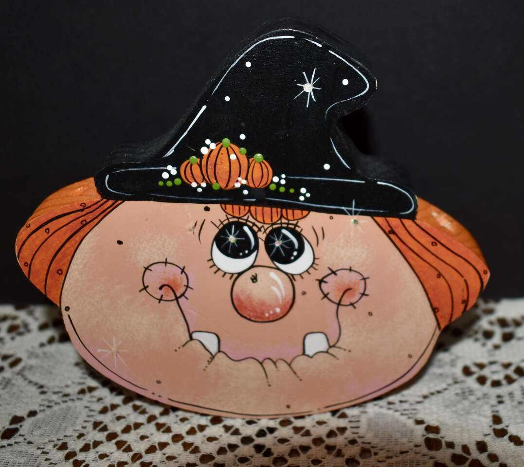 *** THE REALLY CUTE HAND PAINTED WITCHES HEAD MEASURES… APPROX.4 3/4 INCHES ACROSS FROM SIDE TO SIDE AND IT IS 4 1/4 INCHES TALL. ( IT HAS TWO HOLES ON EACH SIDE OF THE HAIR AREA AT THE TOP FOR PUTTING SOMETHING INSIDE FOR HANGING IF YOU WANTED TO. THE METAL