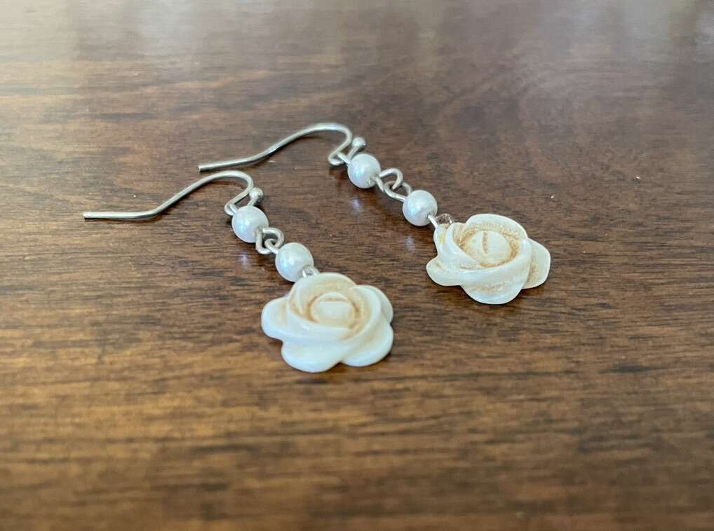I have a pair of vintage flower earrings made of shell or mother of pearl. They are a pale pinkish color. I don’t see any maker’s marks or metal content marks. They are about 1 1/2 inches long. See my other ads for jewelry, artwork, home decor and more.