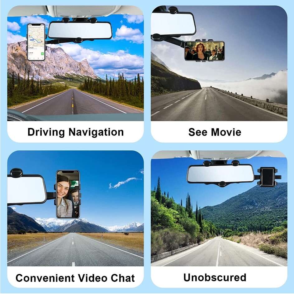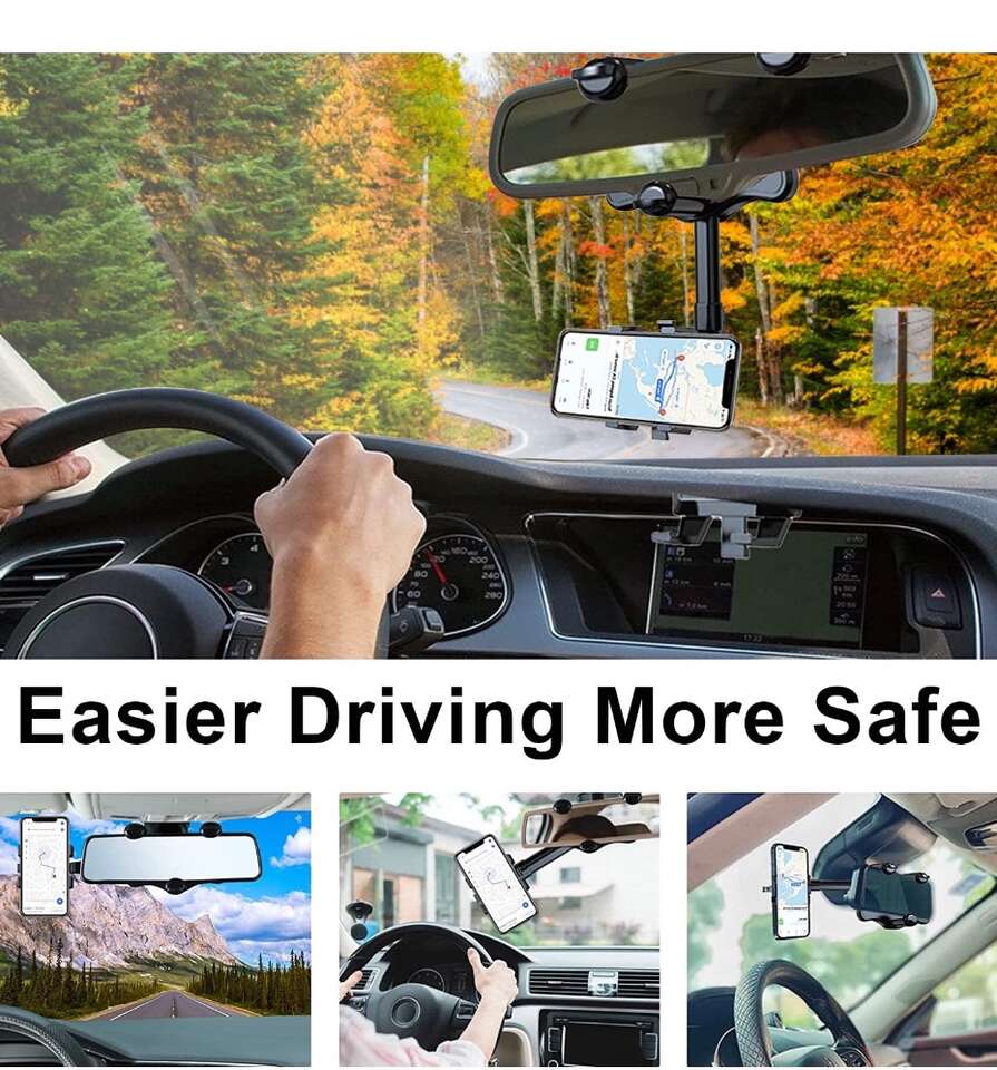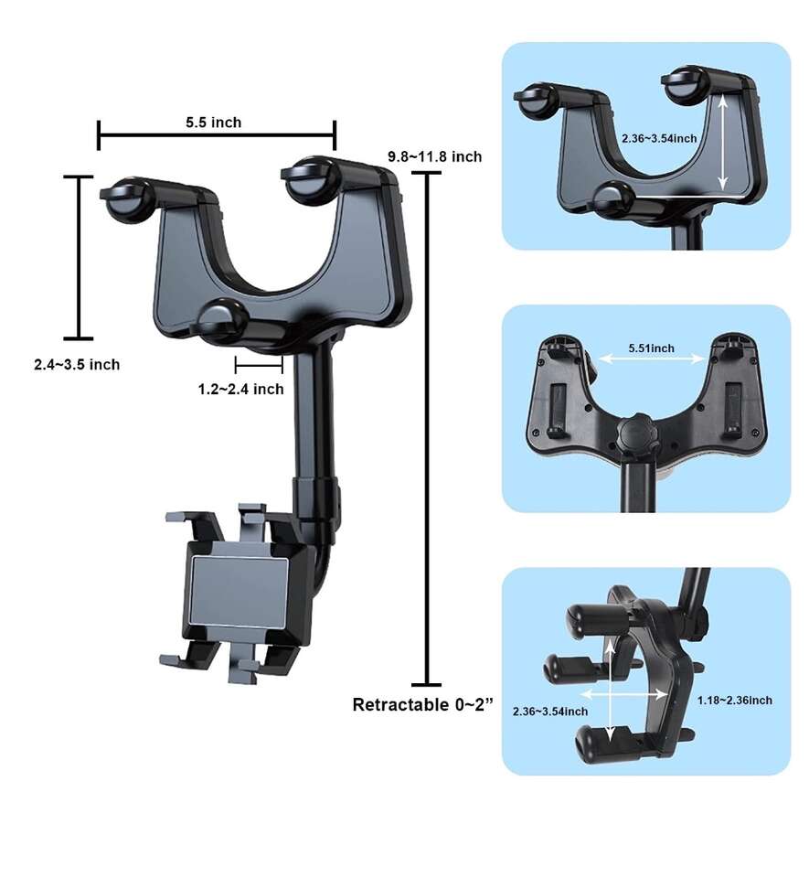 360° Rotatable Rearview Mirror Phone Mount for Car, Retractable Universal Car phone Holder Mount for Car Decor, Four Corners Fixed Anti-Shake Design, for All Mobile Phones and All Car