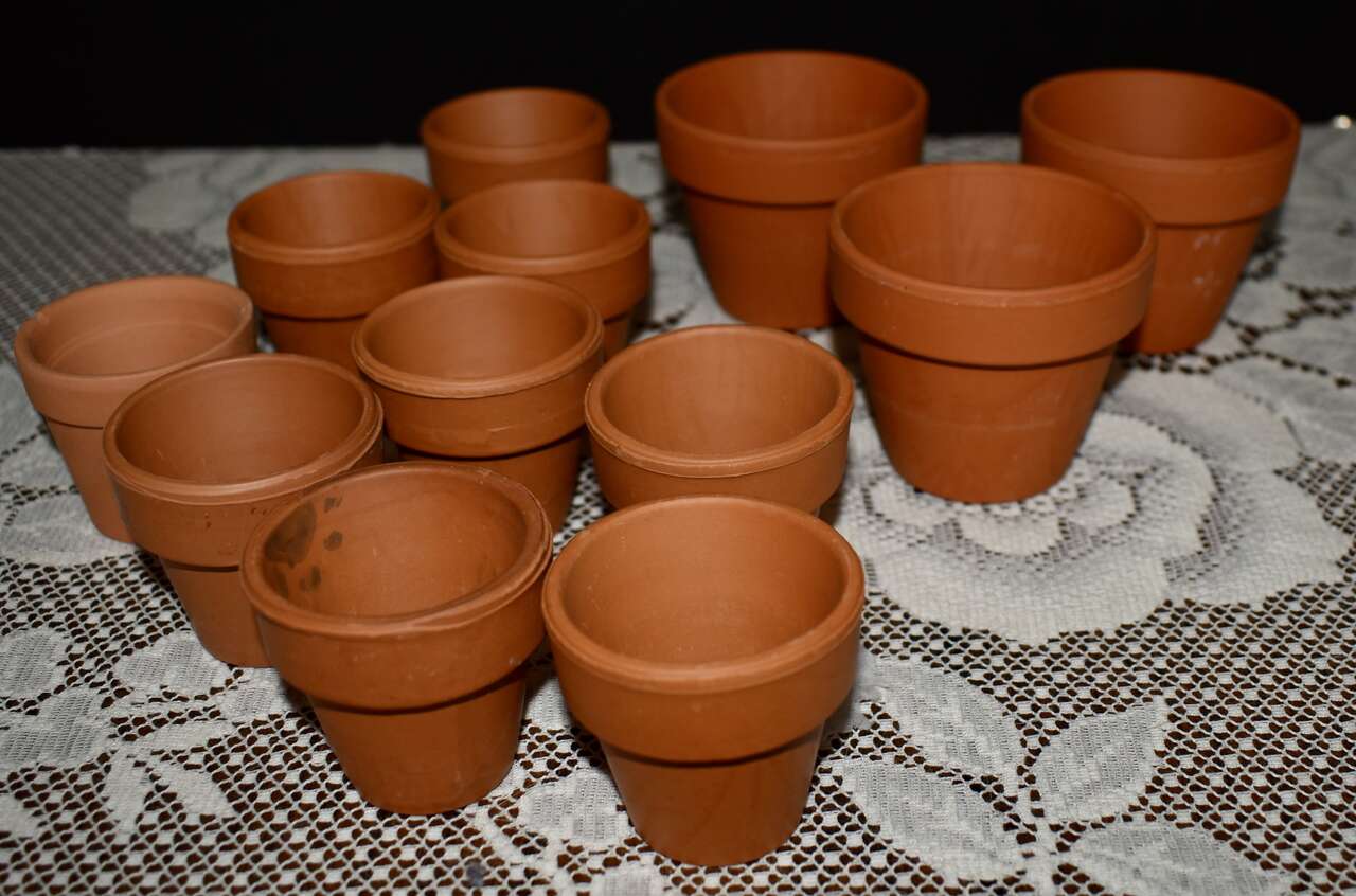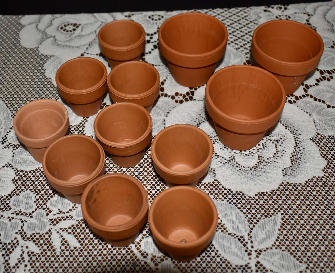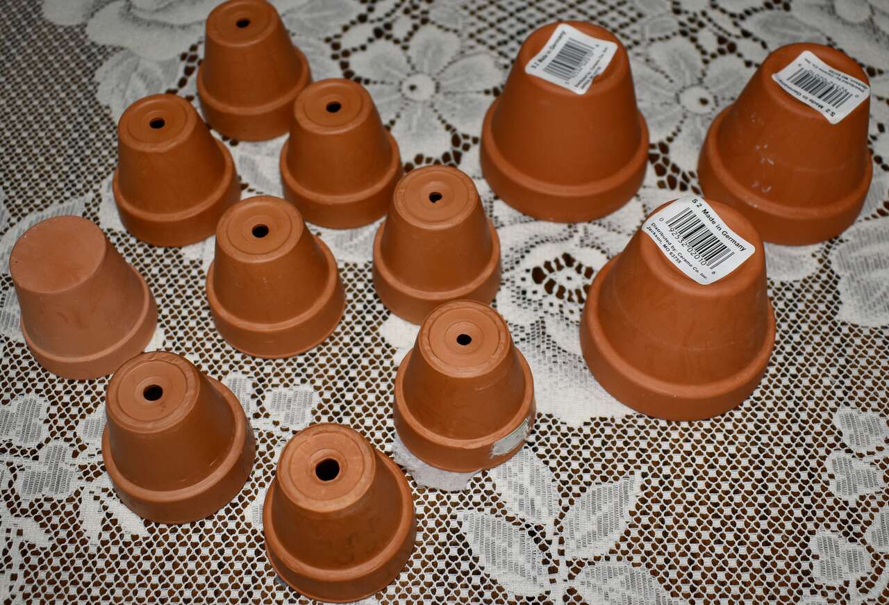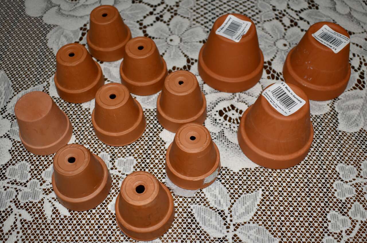 ***AND THEN WE HAVE EIGHT ( 8 ) THAT MEASURE APPROX. 2 INCHES TALL AND THEY MEASURE…APPROX 1 3/4 INCHES ACROSS THE TOP FROM SIDE TO SIDE. AND THEY ALL HAVE HOLES AT THE BOTTOM FOR DRAINING- ( SOME STILL HAVE SOME PAPER FROM OLD PRICES ON THEM.