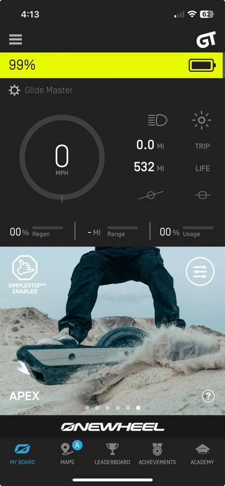 Onewheel GT in excellent condition. Runs perfectly. Only 532 Miles. Upgraded GT High Kick Rear Footpad, charge plug, wheel fender, and carry handle. Has always had rail protectors installed. Metal OneWheel Stand. Will include the hidden Apple AirTag. Charger Included.