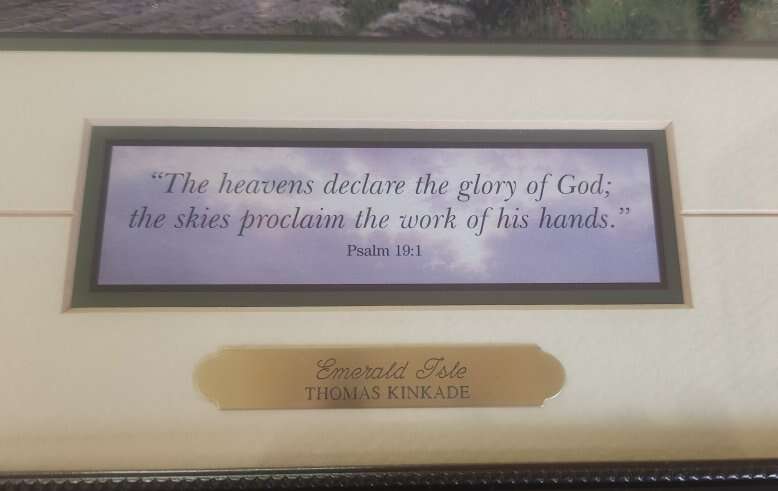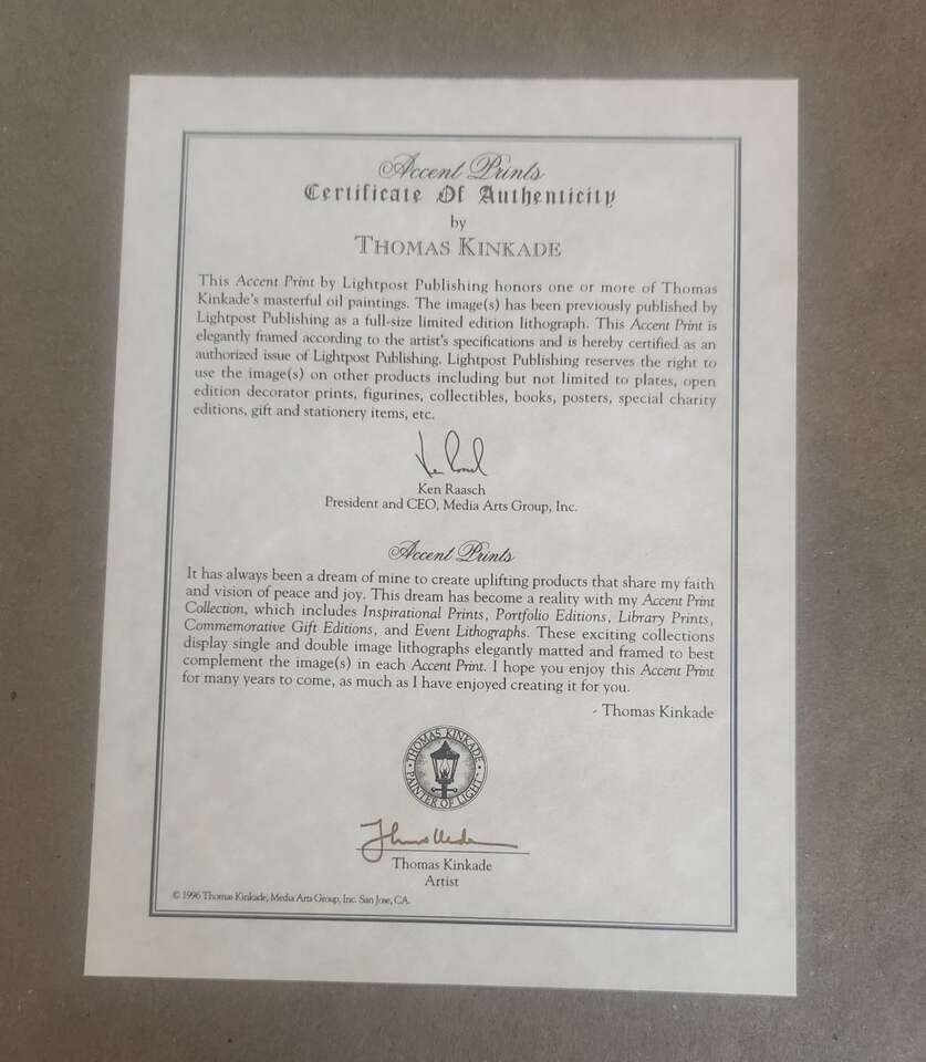 VenmoTHIS LISTING IS FOR A NICE FRAMED THOMAS KINKADE "EMERALD ISLE" FROM 1996. ITS CERTIFICATE OF AUTHENTICITY IS ON THE BACK. THE FRAME SIZE IS 14"X 14"