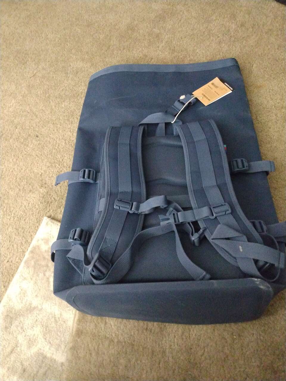 Made of recycled ocean water plastics. Has 15 inch laptop sleeve that is removable.