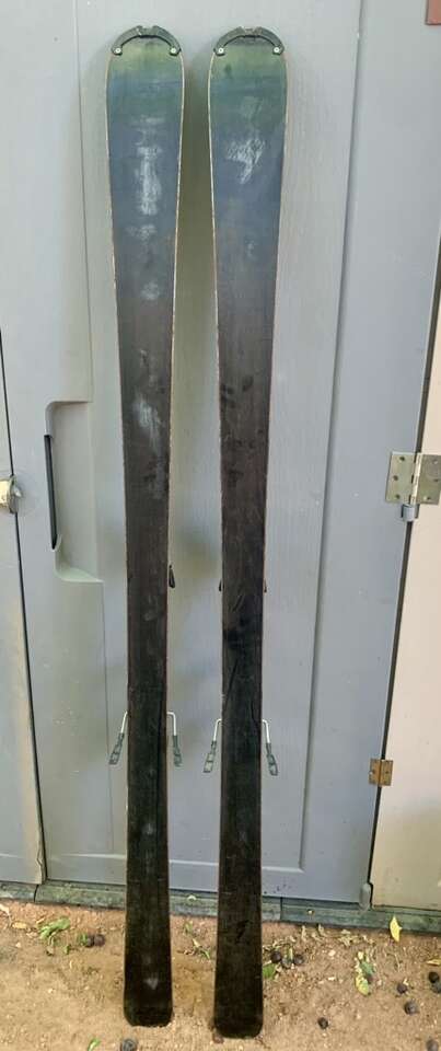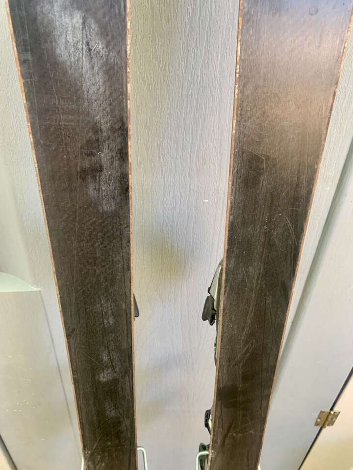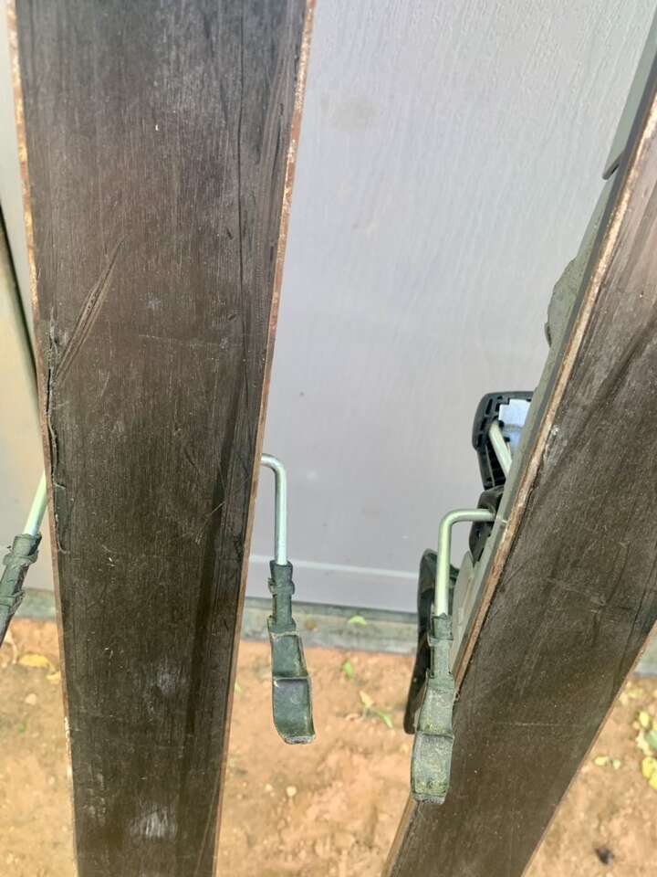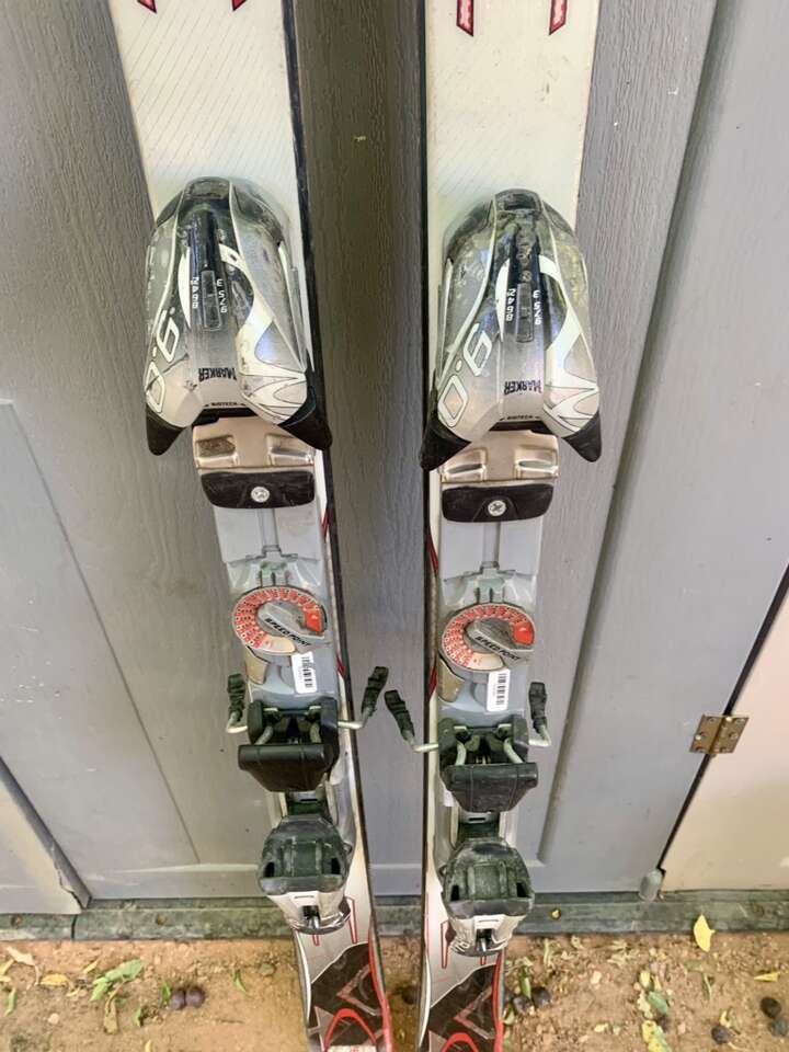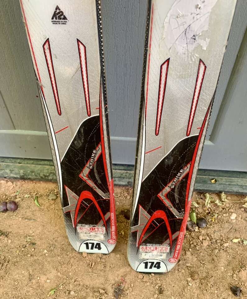 Skis have some light topsheet scratching, could use a edge, and have a gash in one of the bases.