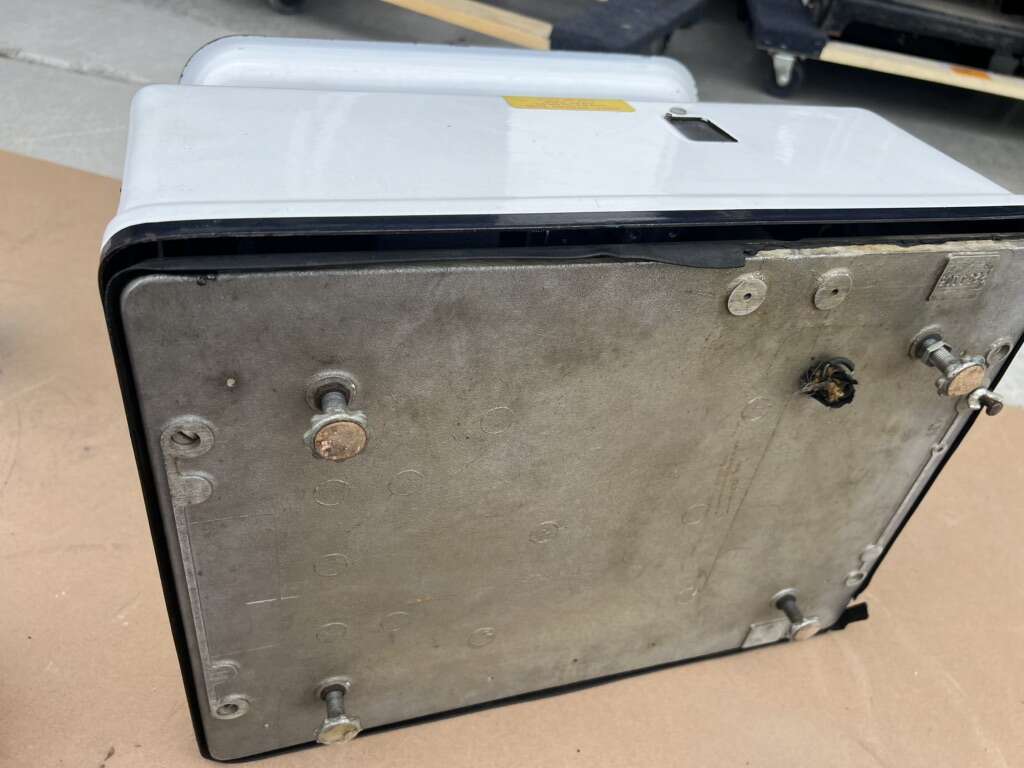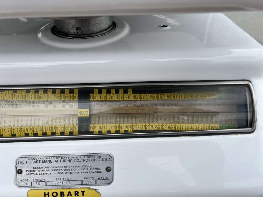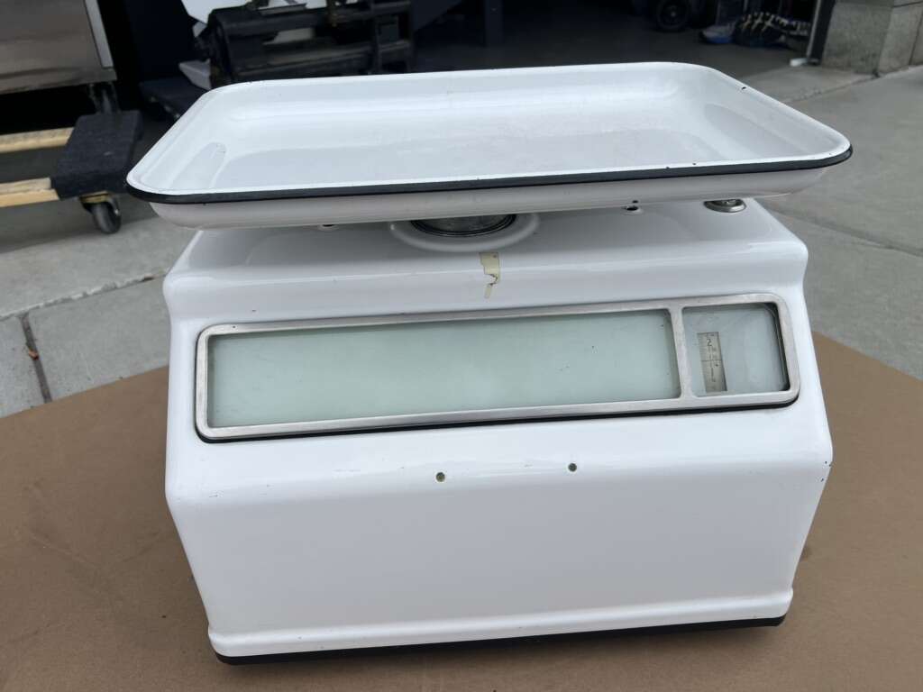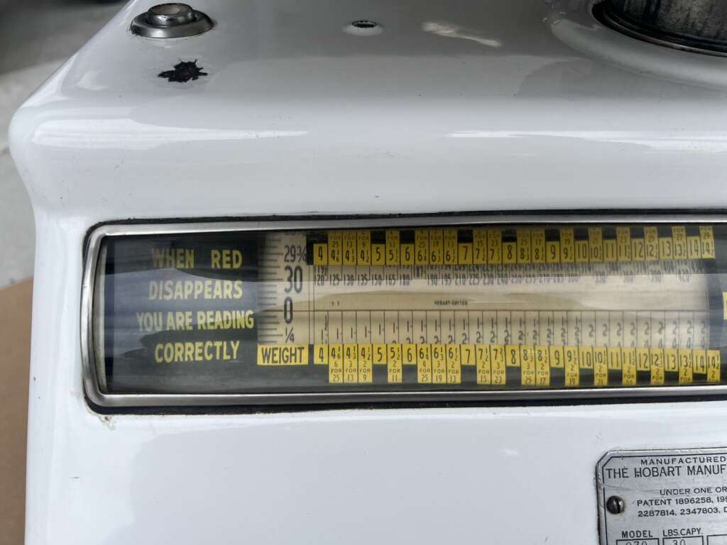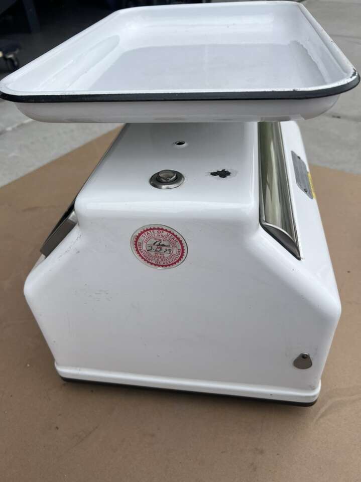 VenmoThis is a vintage produce scale made by Dayton Hobart. It’s in good condition for his age, however, there are a couple of chipped spots in the porcelain enamel, and the cord for the lights has been cut, so I don’t know if the lights work.