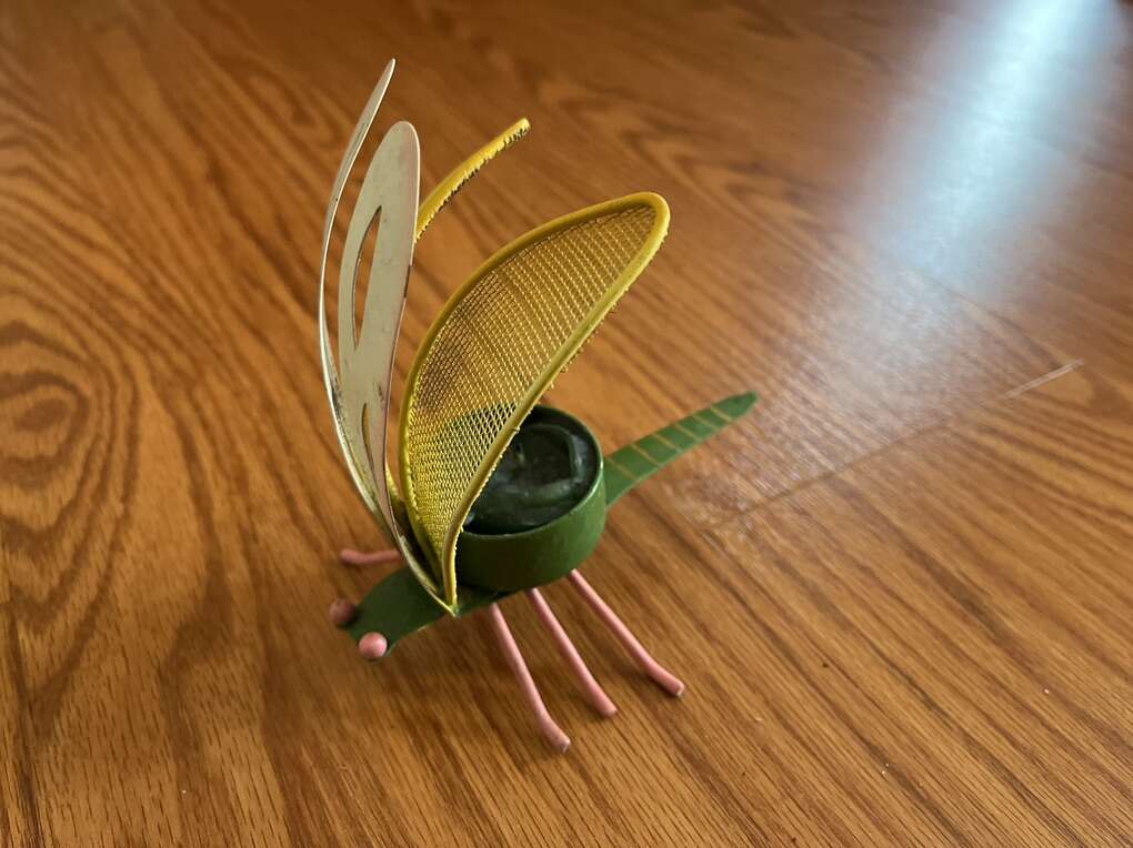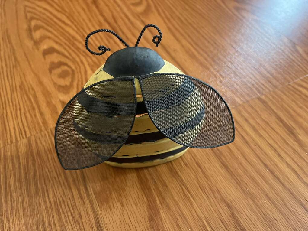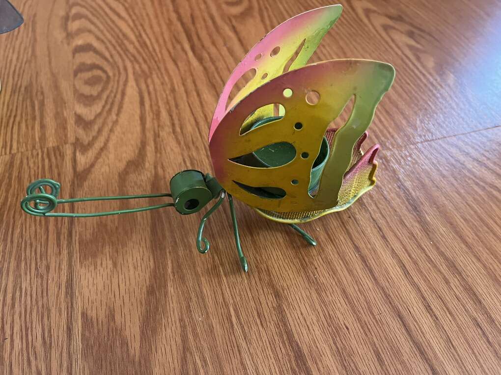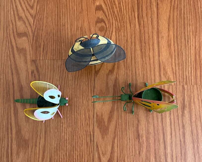 Up to 5” high x 5”-8” long metal/mesh bugs: bee, butterfly and dragonfly outdoor candle holders. Cute, colorful, ideal decor for any patio/balcony/porch settings. $5 each or $12 for all.