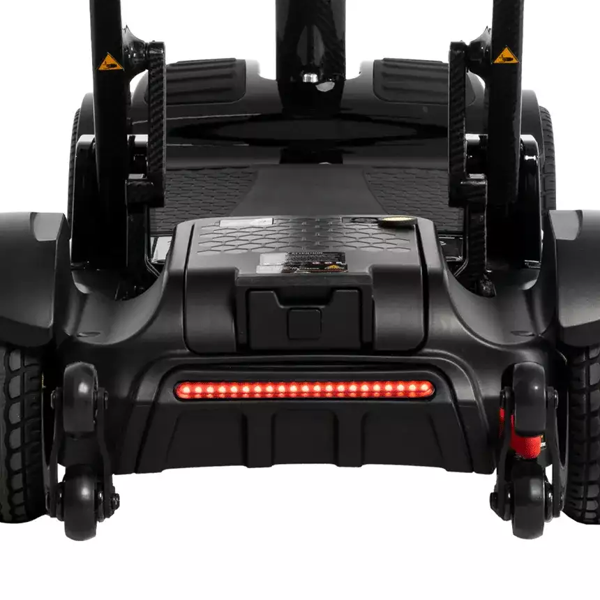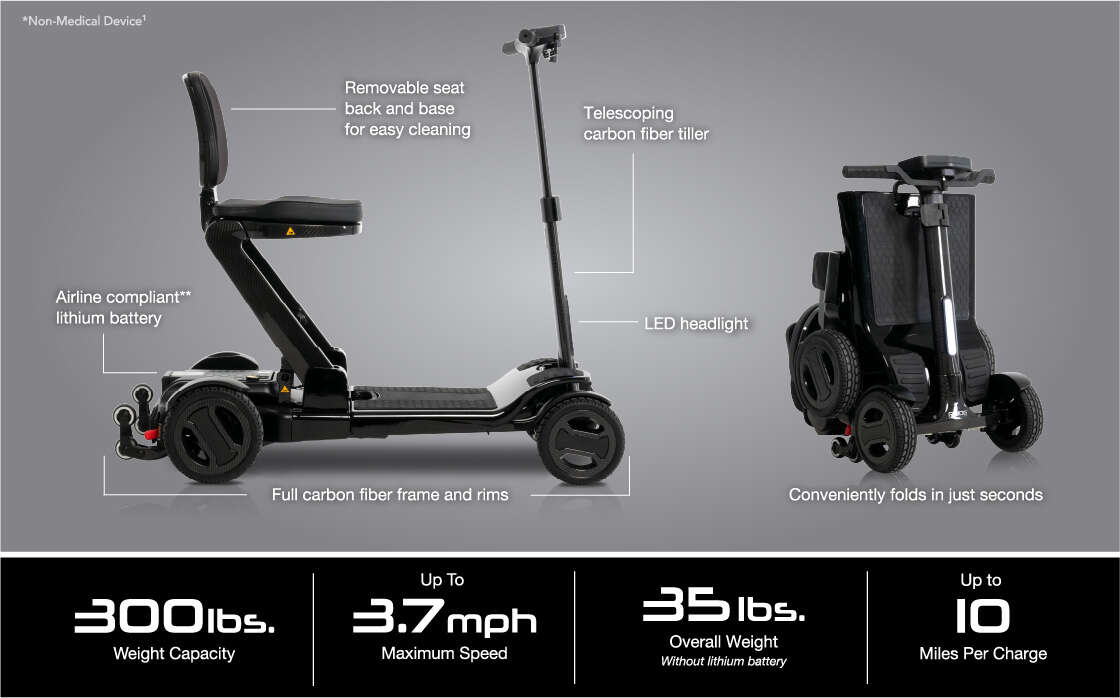 Folds down in just seconds and can be towed like luggage. The carbon weighs just 35 lbs without battery and 39 lbs with battery.
