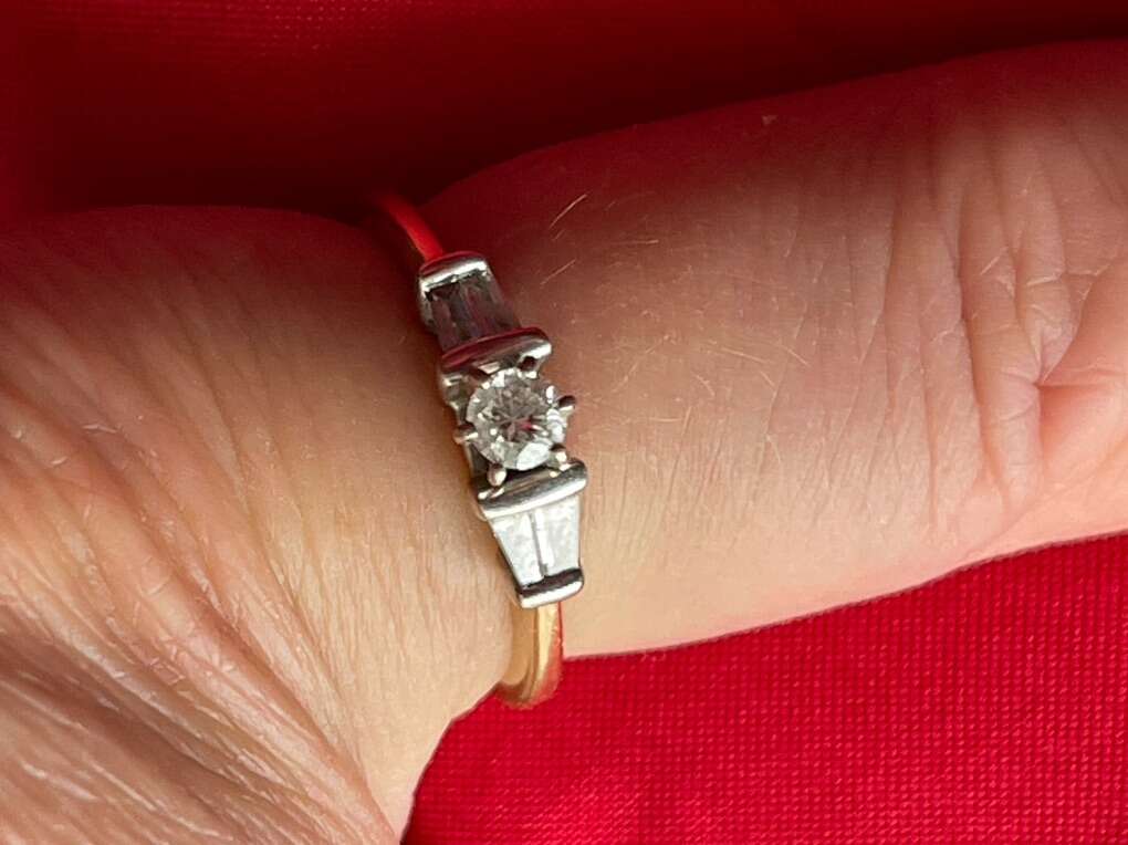 This vintage engagement ring is a true beauty, fit for a princess. Crafted from 14k two-tone white and yellow gold, it boasts a stunning 1/2 (approx) carat round cut diamond baguette set in a gold band. The diamond is ungraded but has a white/colorless hue that adds to the ring's overall elegance and weighs 2.4 grams.