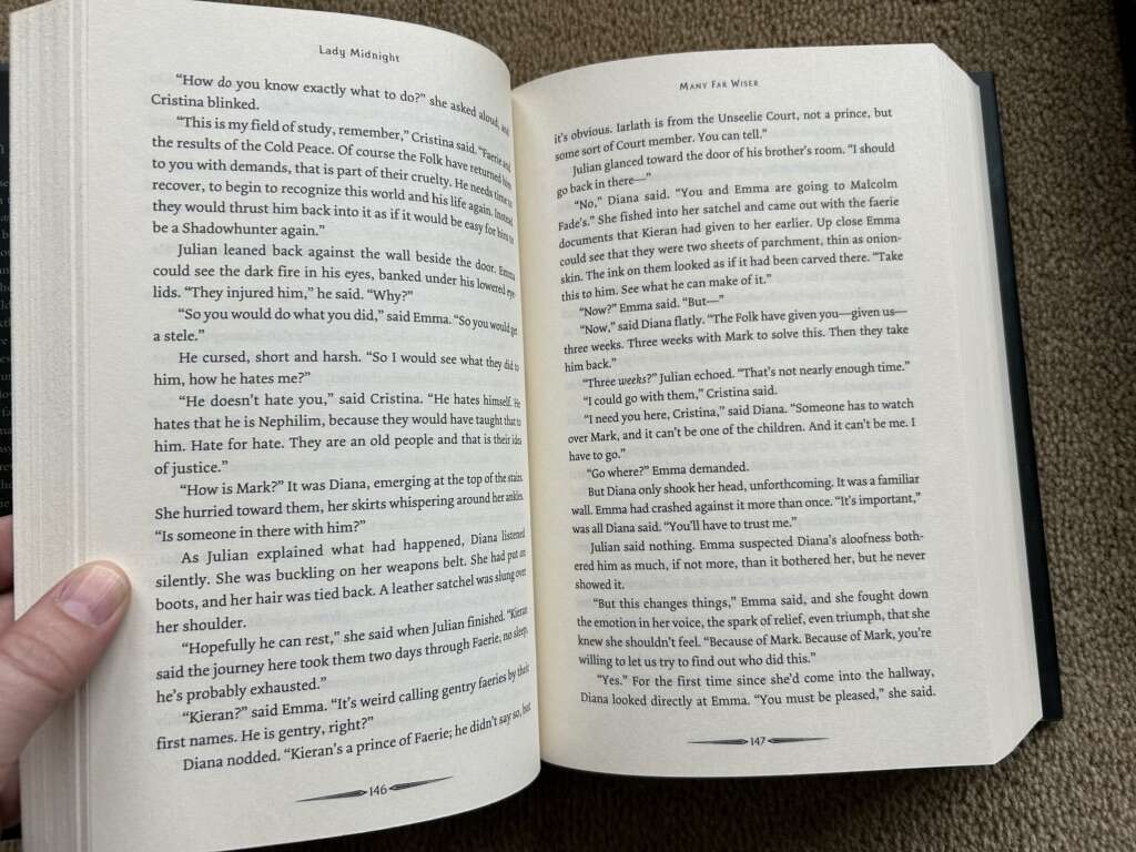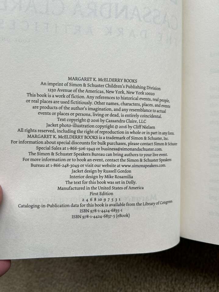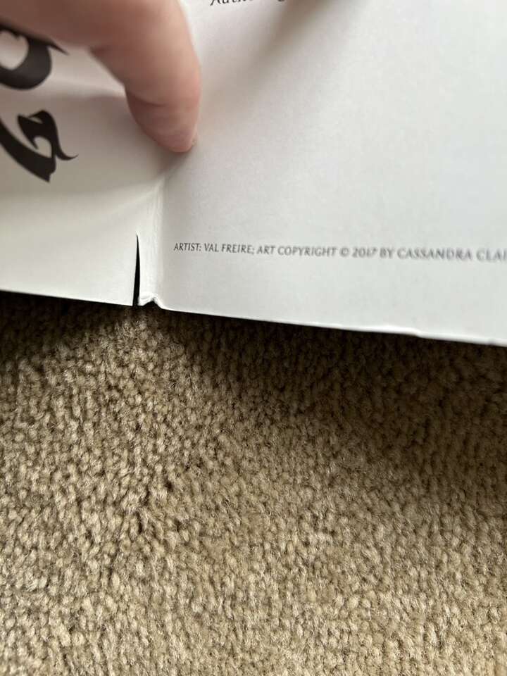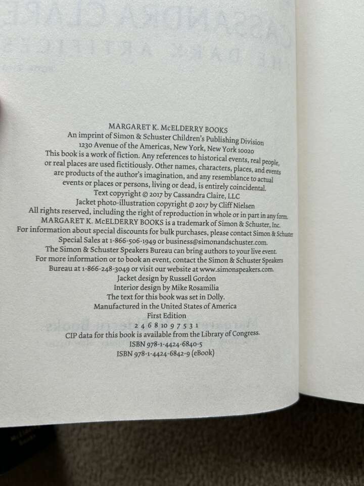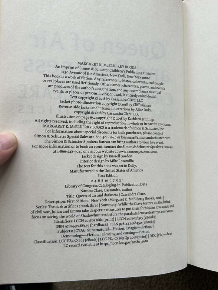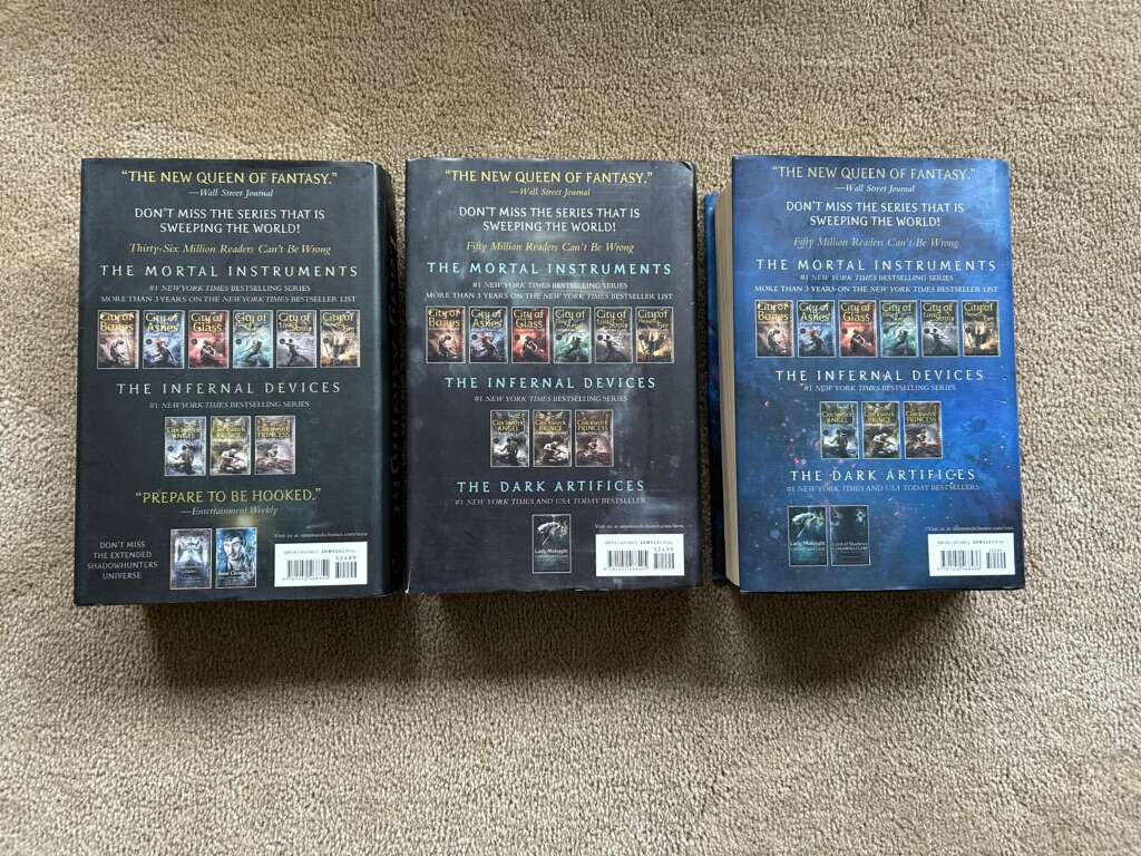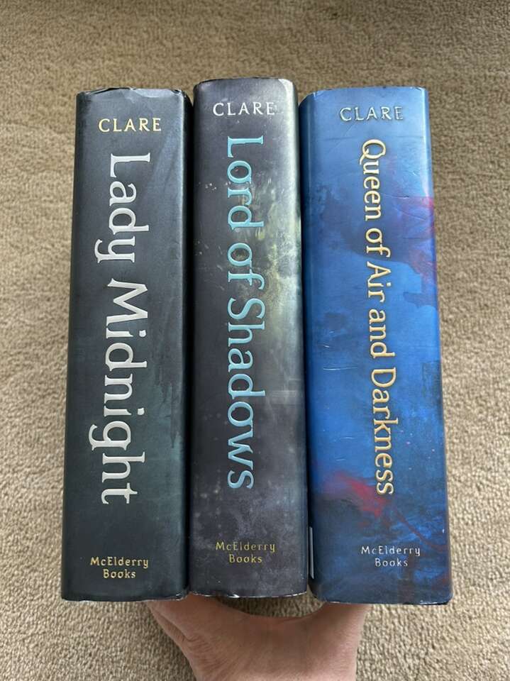The Dark Artifices Trilogy (Shadowhunters Novels), by Cassandra Clare: Lady Midnight (2016, 668 pages—SIGNED by the author [stamp]), Lord of Shadows (2017, 699 pages—special dust jacket), and Queen of Air and Darkness (2018, 880 pages—special dust jacket and illustrations). First edition hardcovers in excellent condition, including dust jackets (one small tear at bottom of book 2–see photos). Text only. Cash or Venmo.