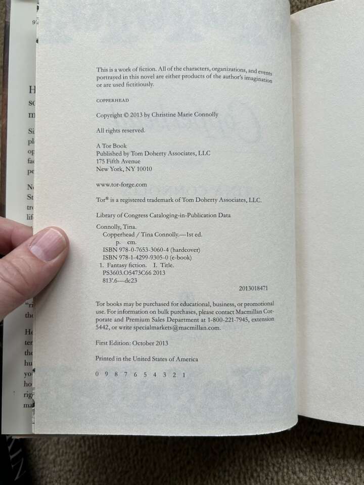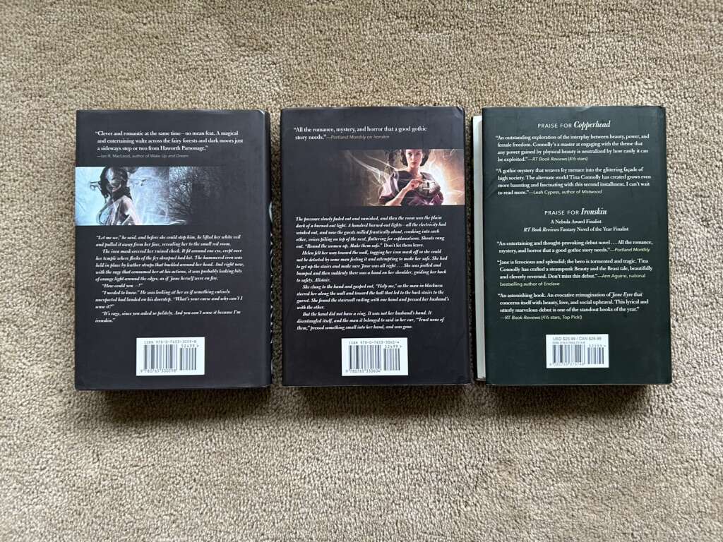 Ironskin Series 1-3, by Tina Connolly: Ironskin (2012, 304 pages—SIGNED by the author on title page), Copperhead (2013, 318 pages), and Silverblind (2014, 315 pages). Also includes limited edition (numbered 239/250) postcard signed by the author (see photos). Tor Publishing, all first edition hardcovers in excellent condition, including dust jackets. Text only. Cash or Venmo.